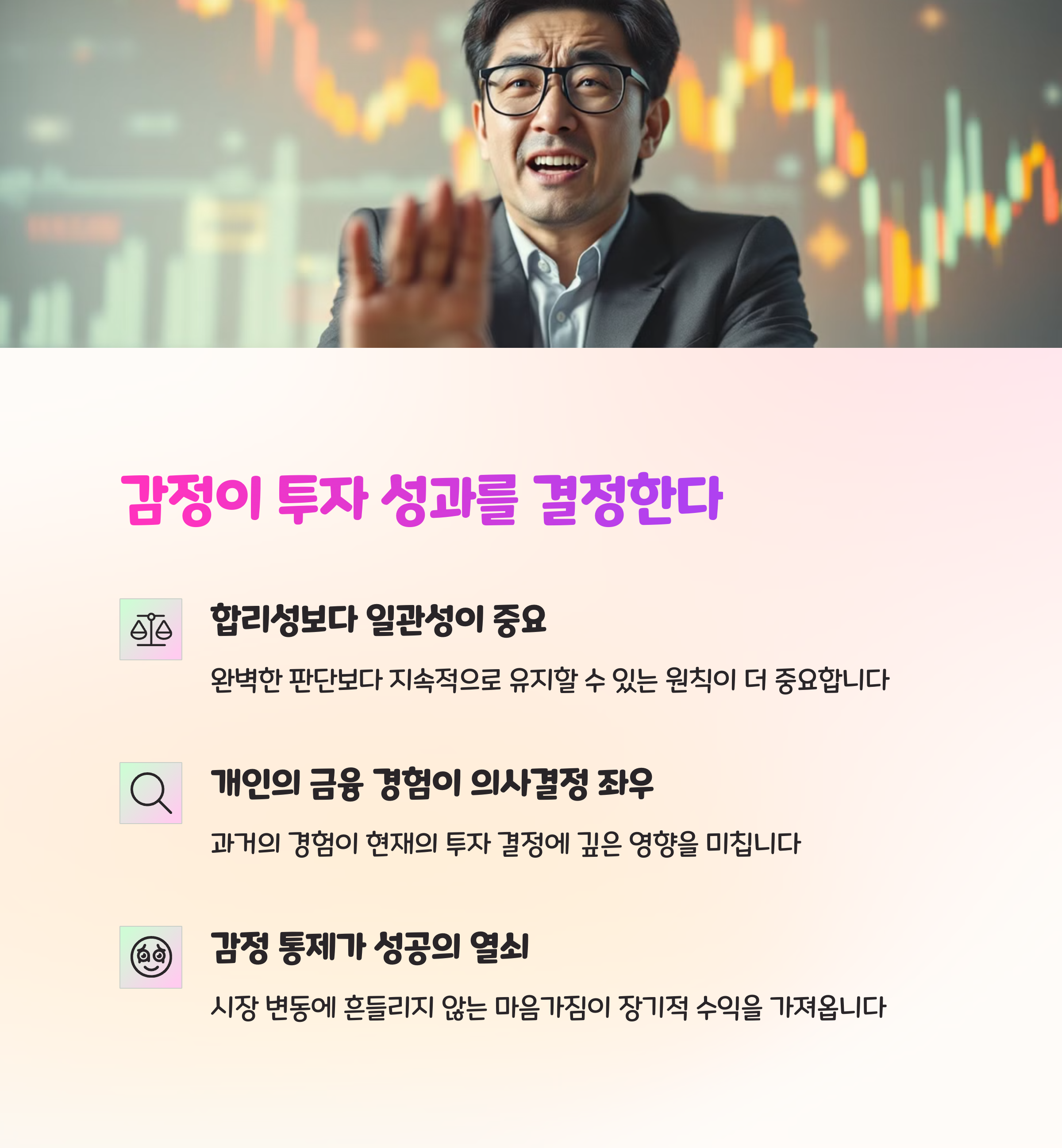 | 수치 중심 분석보다, 행동 패턴과 심리를 이해하는 것이 더 중요하다는 개념 | 두려움, 탐욕, 기대, 불안 등이 투자 판단에 어떻게 작용하는지 탐색 | 자신이 어떤 상황에서 어떤 선택을 반복하는지 인식하고 개선하려는 노력 |