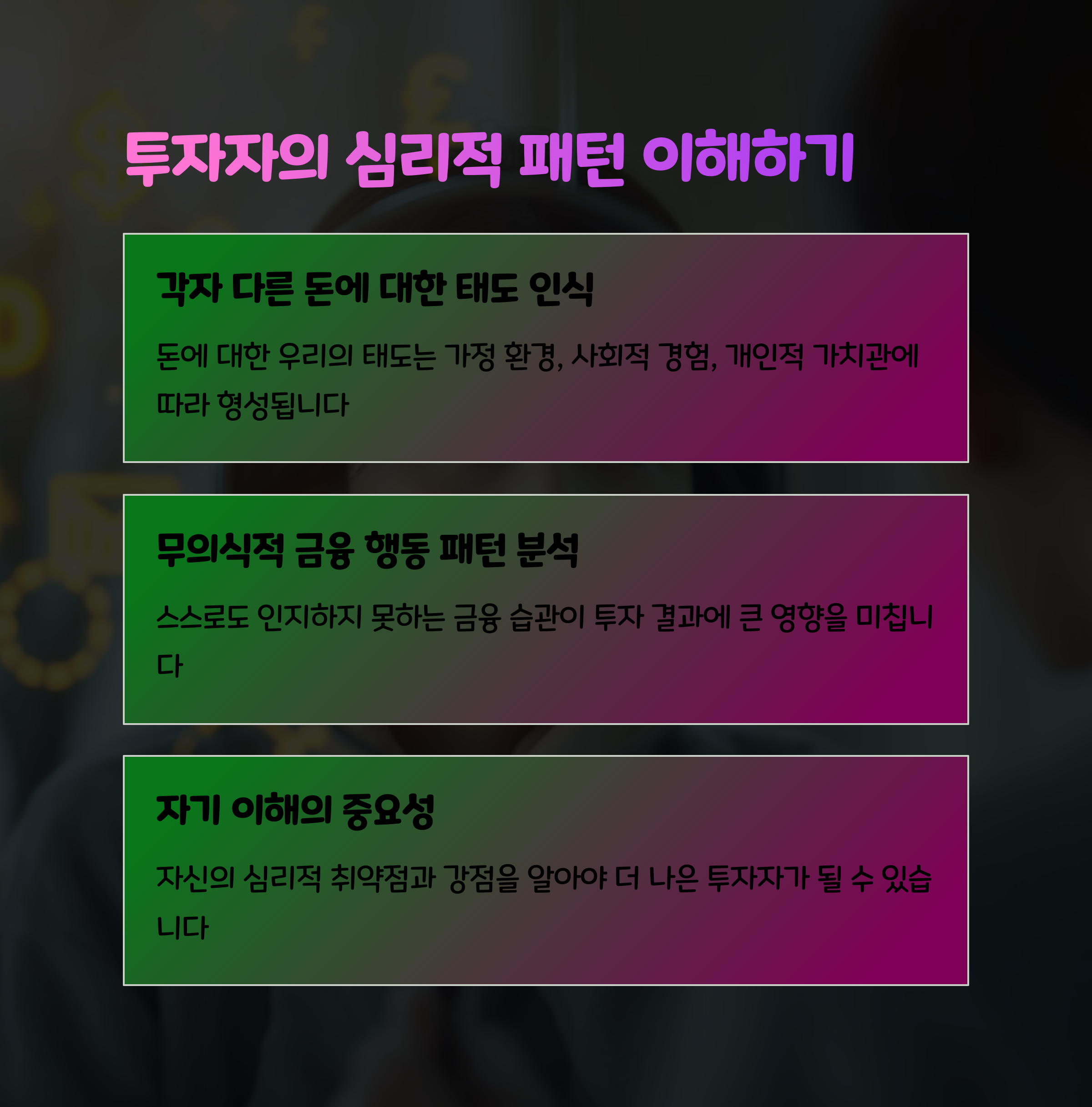 | 수치 중심 분석보다, 행동 패턴과 심리를 이해하는 것이 더 중요하다는 개념 | 두려움, 탐욕, 기대, 불안 등이 투자 판단에 어떻게 작용하는지 탐색 | 자신이 어떤 상황에서 어떤 선택을 반복하는지 인식하고 개선하려는 노력 |