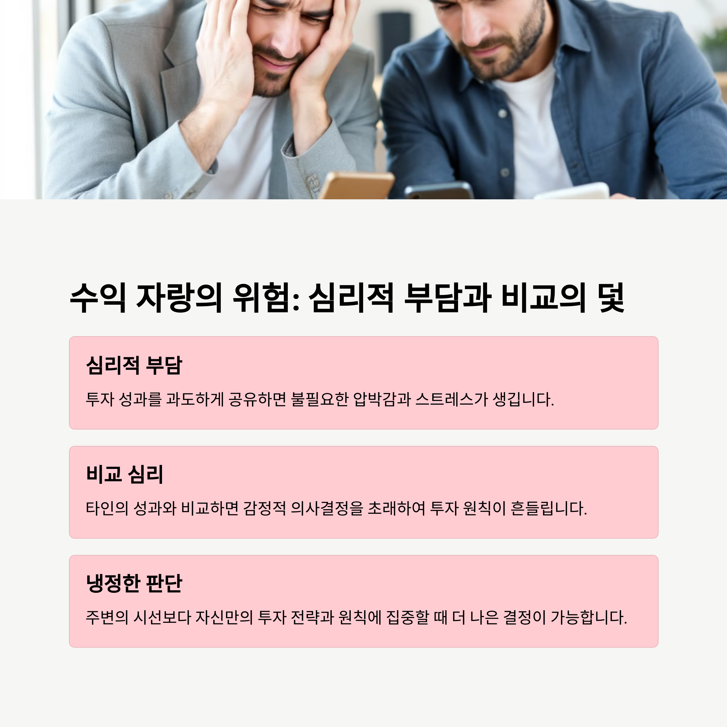 | 수익 공개의 문제점 | 자랑은 타인의 부러움과 비교심리를 자극하며, 이후의 투자 판단에 감정이 개입되는 계기가 된다. |