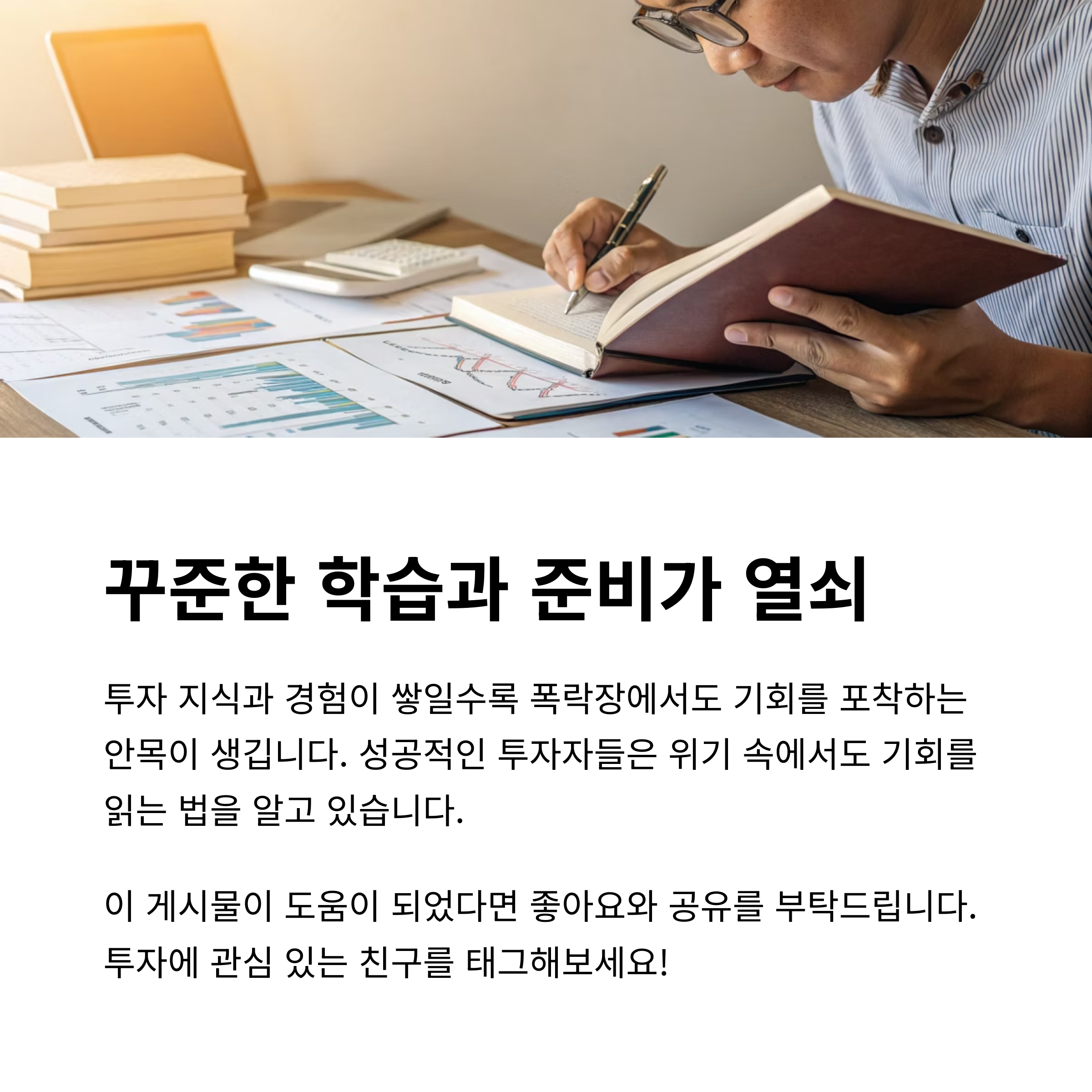 오늘 콘텐츠가 도움이 되셨나요? 폭락장에 대한 여러분의 생각이나 경험을 댓글로 나눠주시면, 다음 콘텐츠 기획에 큰 도움이 됩니다. 읽어주셔서 감사합니다!
