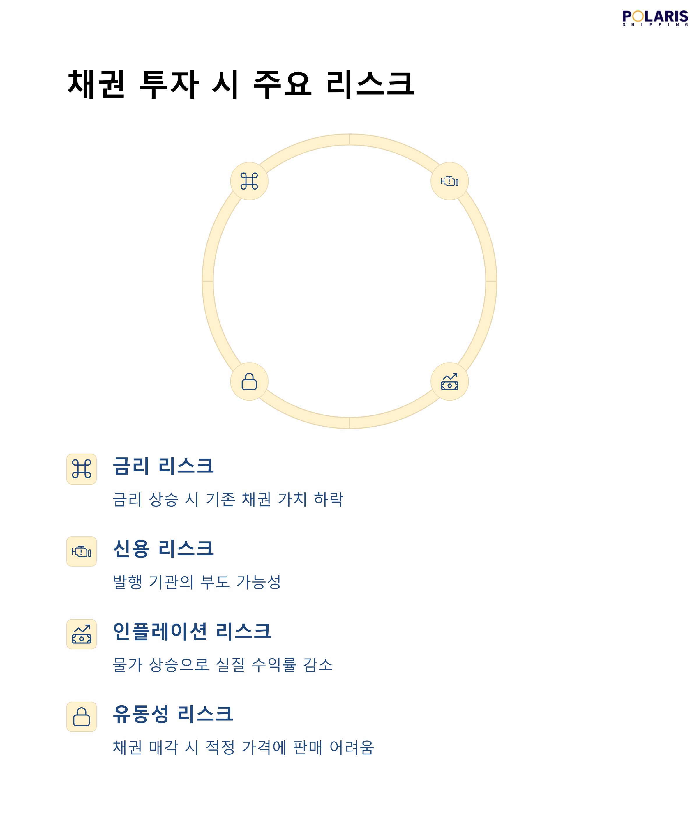 | 금리가 오르면 채권 가격은 하락, 반대도 성립 | AAA, AA 등급 채권은 상대적으로 안전함 | 장기 채권은 금리 변화에 민감하게 반응함 |