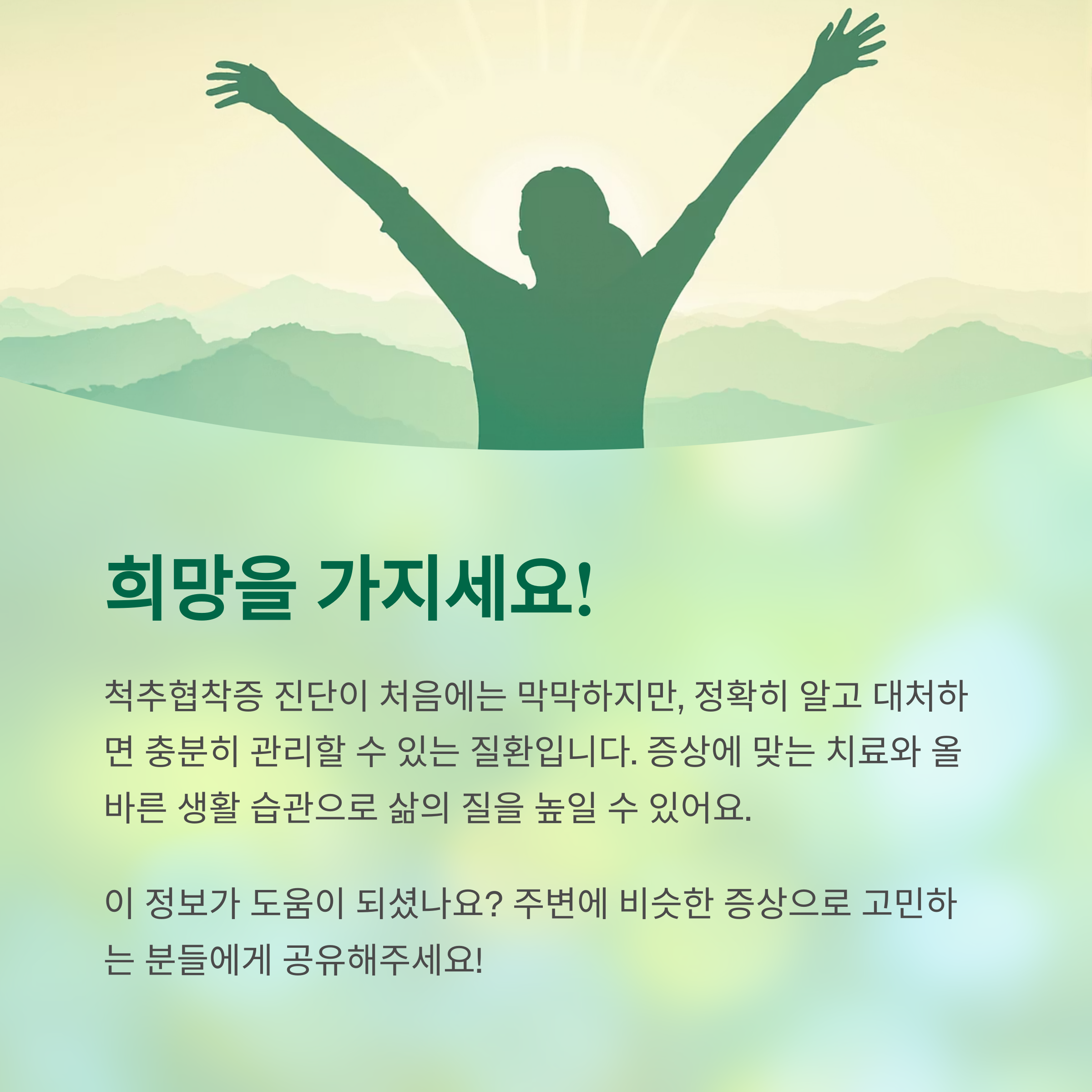 이 글이 여러분에게 작은 위로와 도움이 되었길 바랍니다. 앞으로도 척추 건강, 꾸준히 챙겨주세요.
