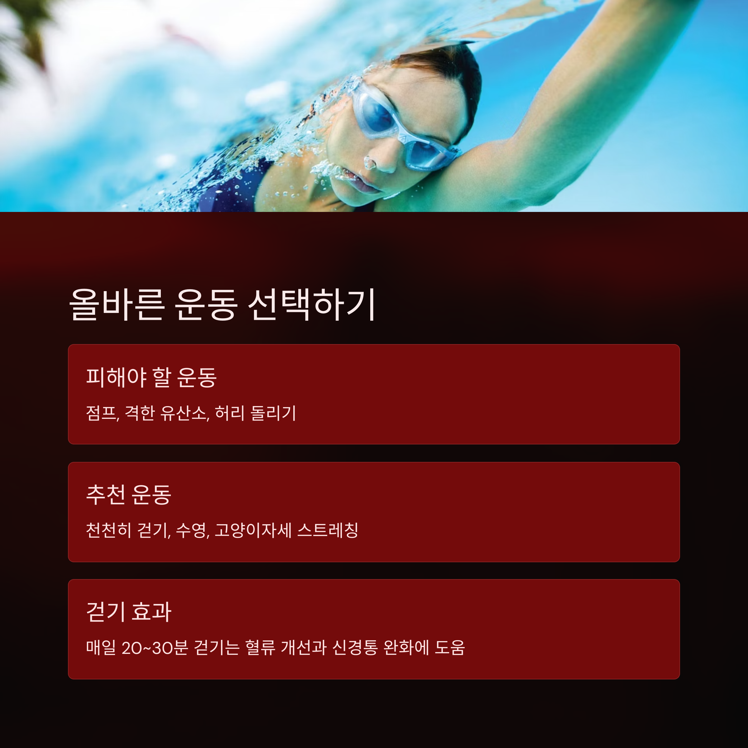 - 추천 운동: 천천히 걷기, 수영, 고양이자세 스트레칭 등