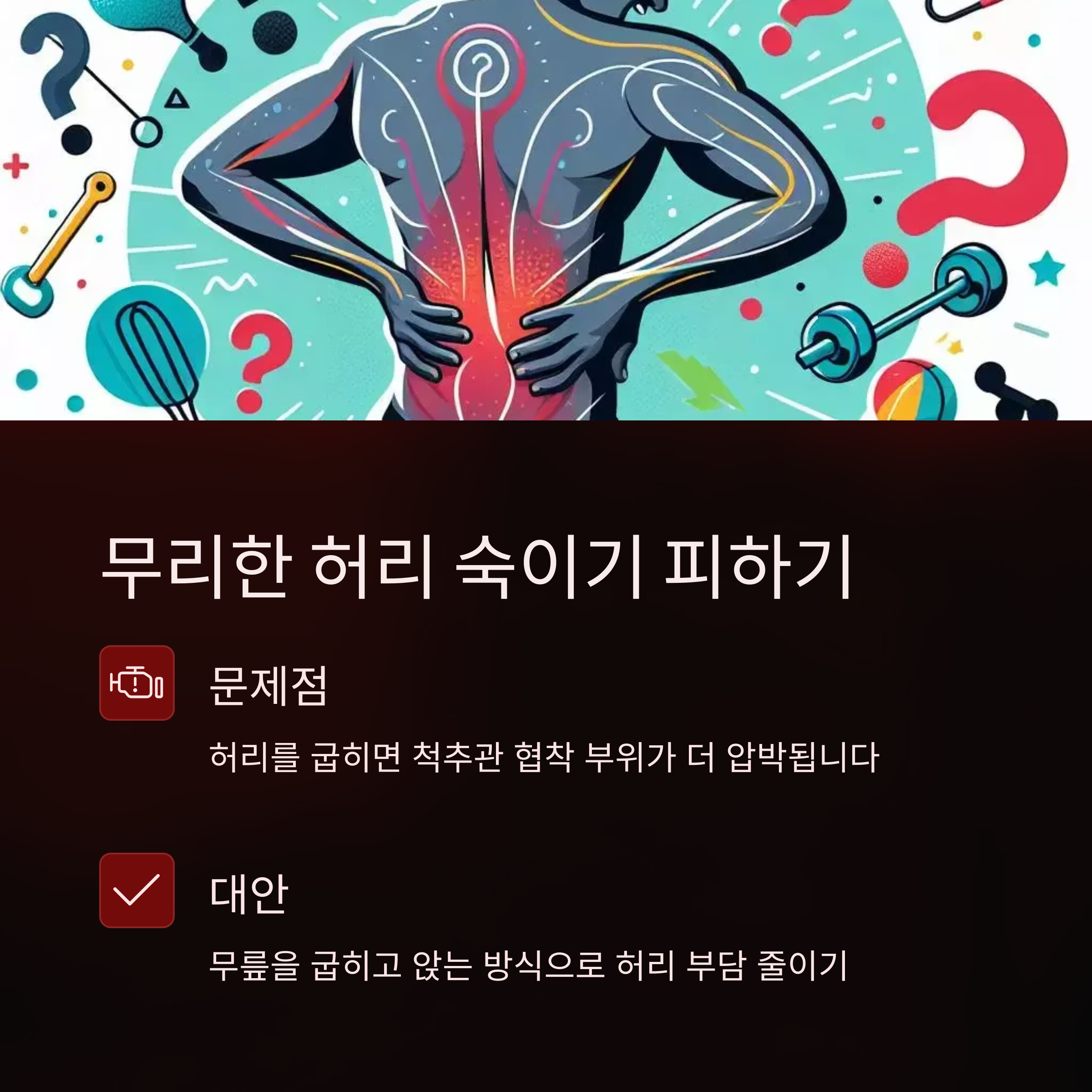 - 점프, 격한 유산소, 허리 돌리기 등은 척추에 자극을 줄 수 있어 피해야 함