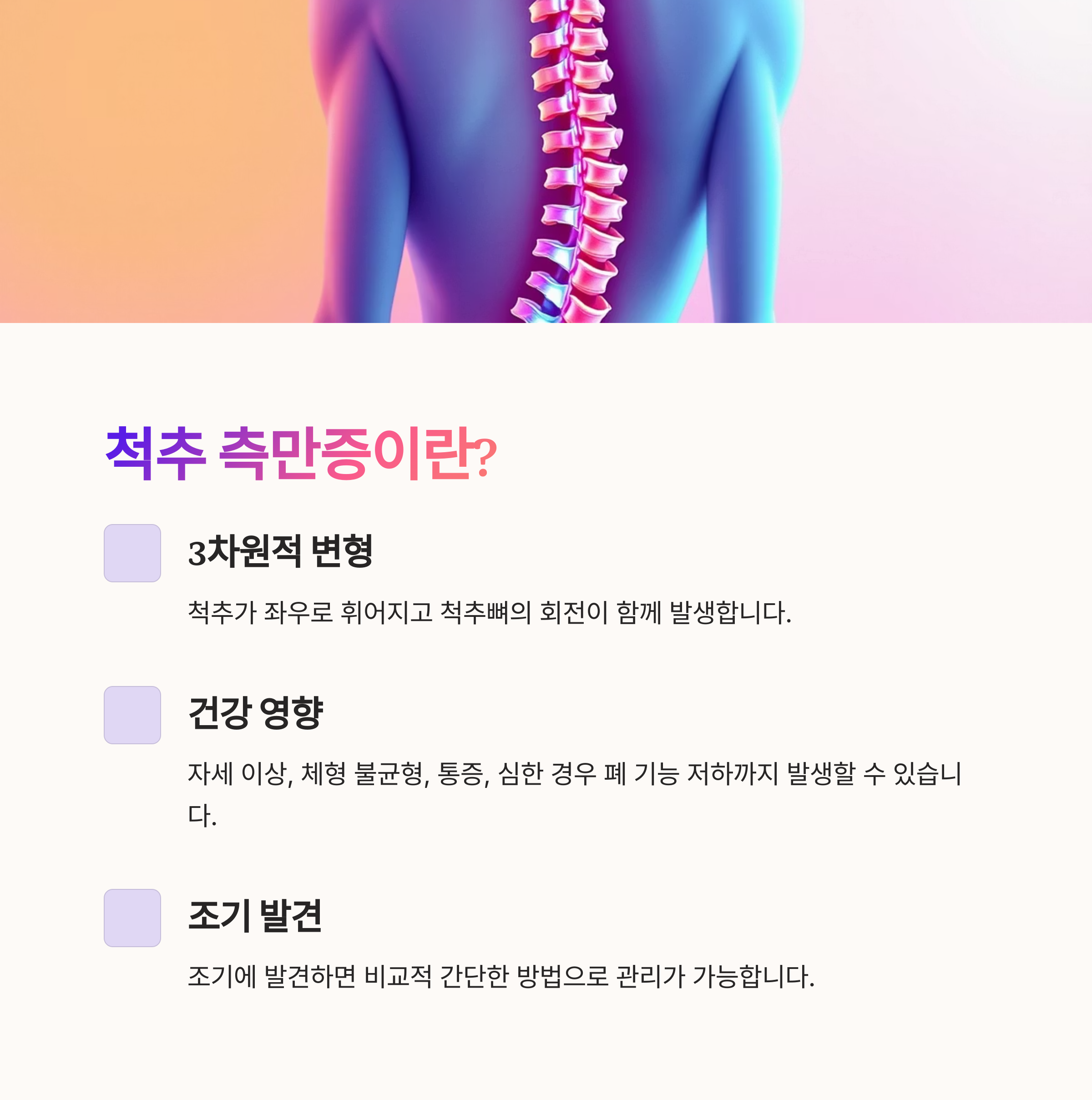 이러한 변화는 자세 이상은 물론, 체형 불균형이나 통증, 심한 경우에는 폐 기능 저하로 이어질 수 있습니다.