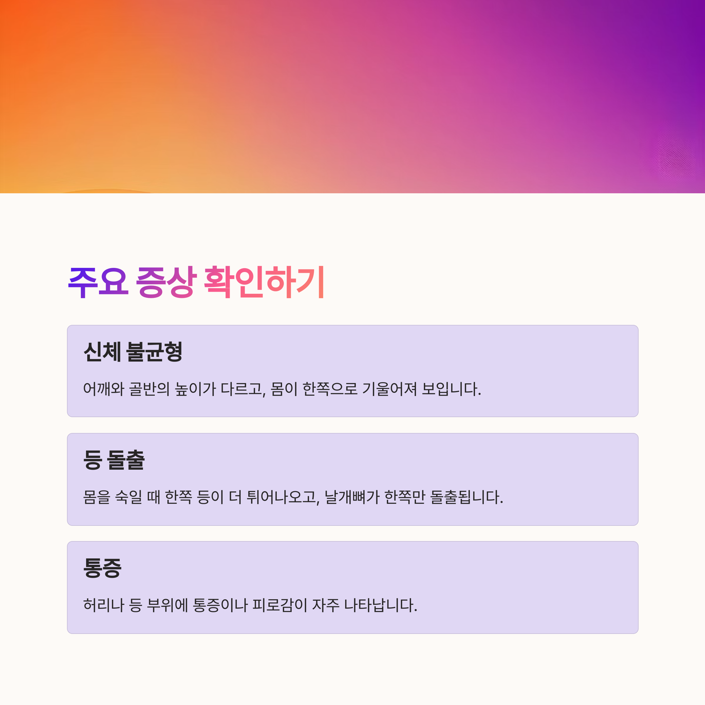 이러한 변화는 자세 이상은 물론, 체형 불균형이나 통증, 심한 경우에는 폐 기능 저하로 이어질 수 있습니다.
