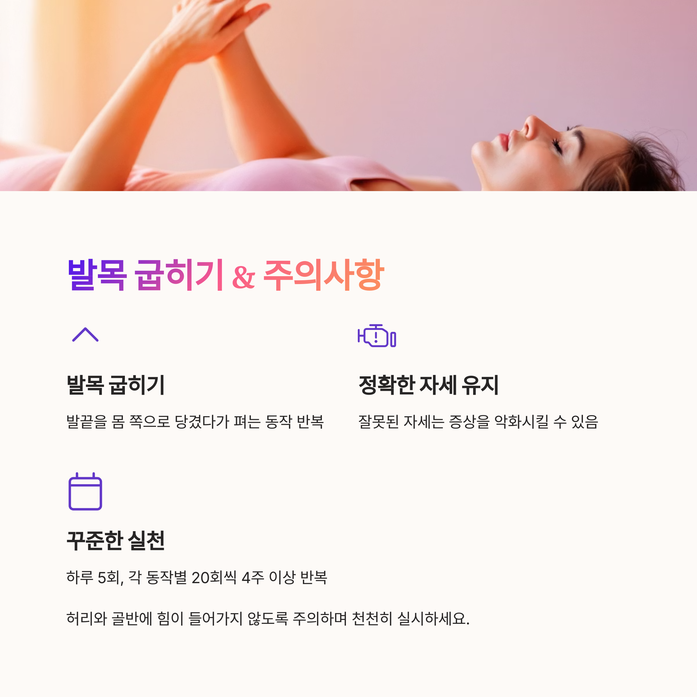 누운 상태에서 발끝을 몸 쪽으로 당겼다가 펴는 동작을 반복하며, 종아리와 허벅지 근육에 약간의 긴장이 느껴질 정도까지만 실시합니다.