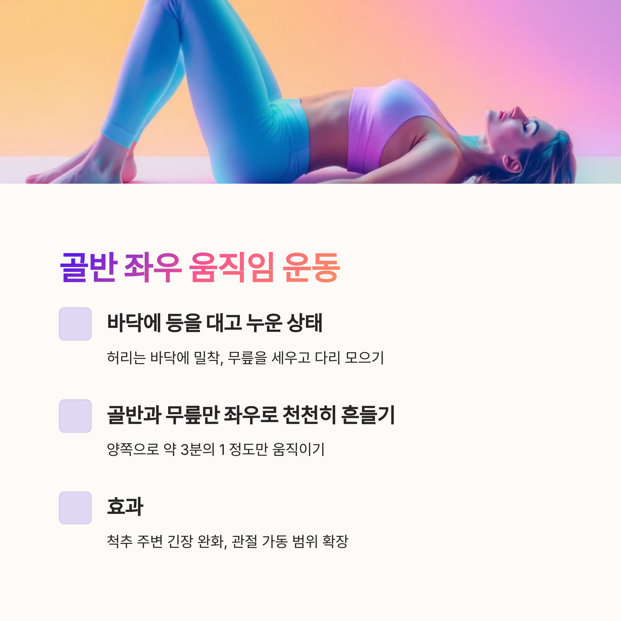 이때 허리는 바닥에 밀착시켜야 하며, 골반과 무릎만 좌우로 천천히 흔드는 것이 핵심입니다.