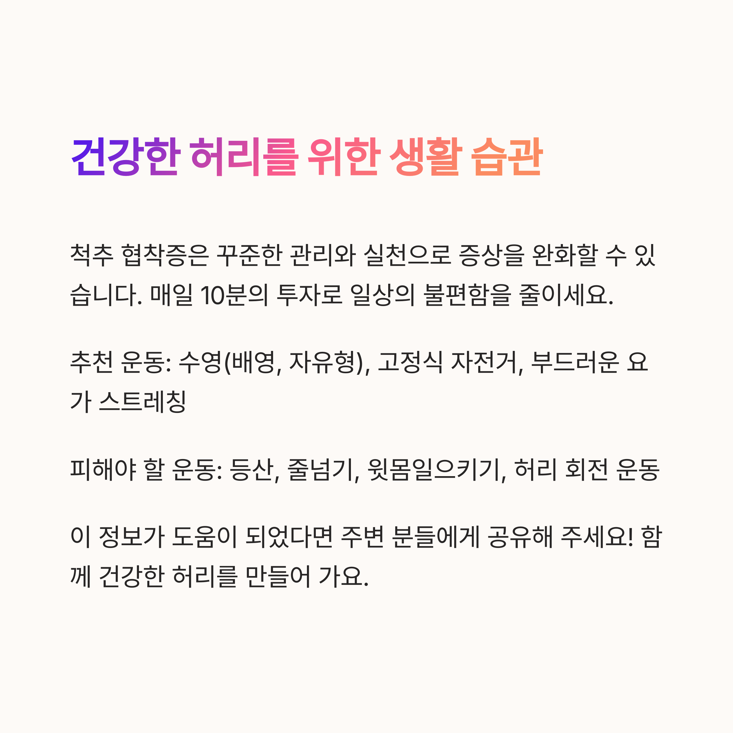 척추 협착증은 꾸준한 관리와 실천으로 증상을 완화할 수 있는 질환입니다.