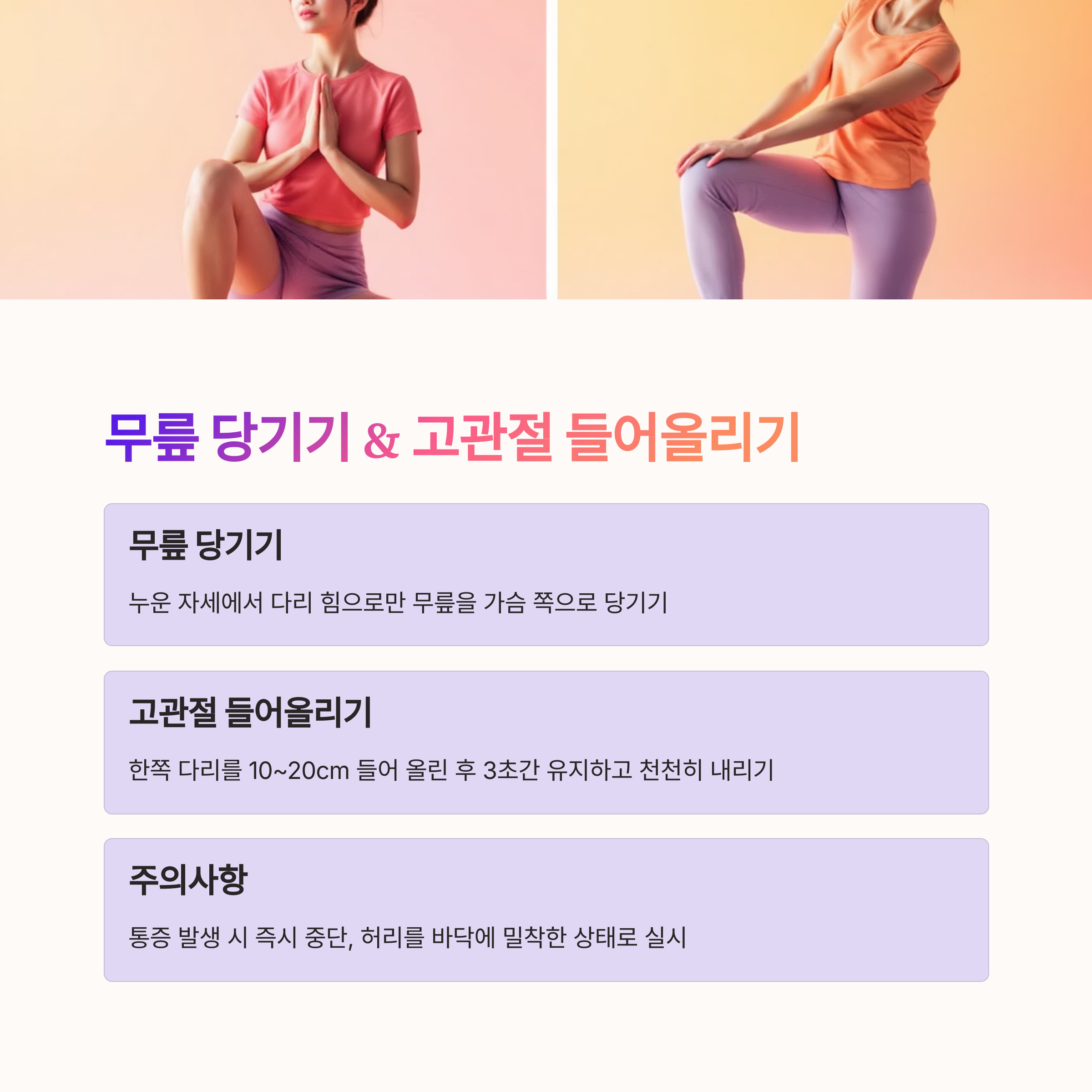 너무 큰 움직임은 허리에 무리를 줄 수 있으므로 피해야 하며, 천천히 호흡을 하며 실시하는 것이 안정성을 높여 줍니다.