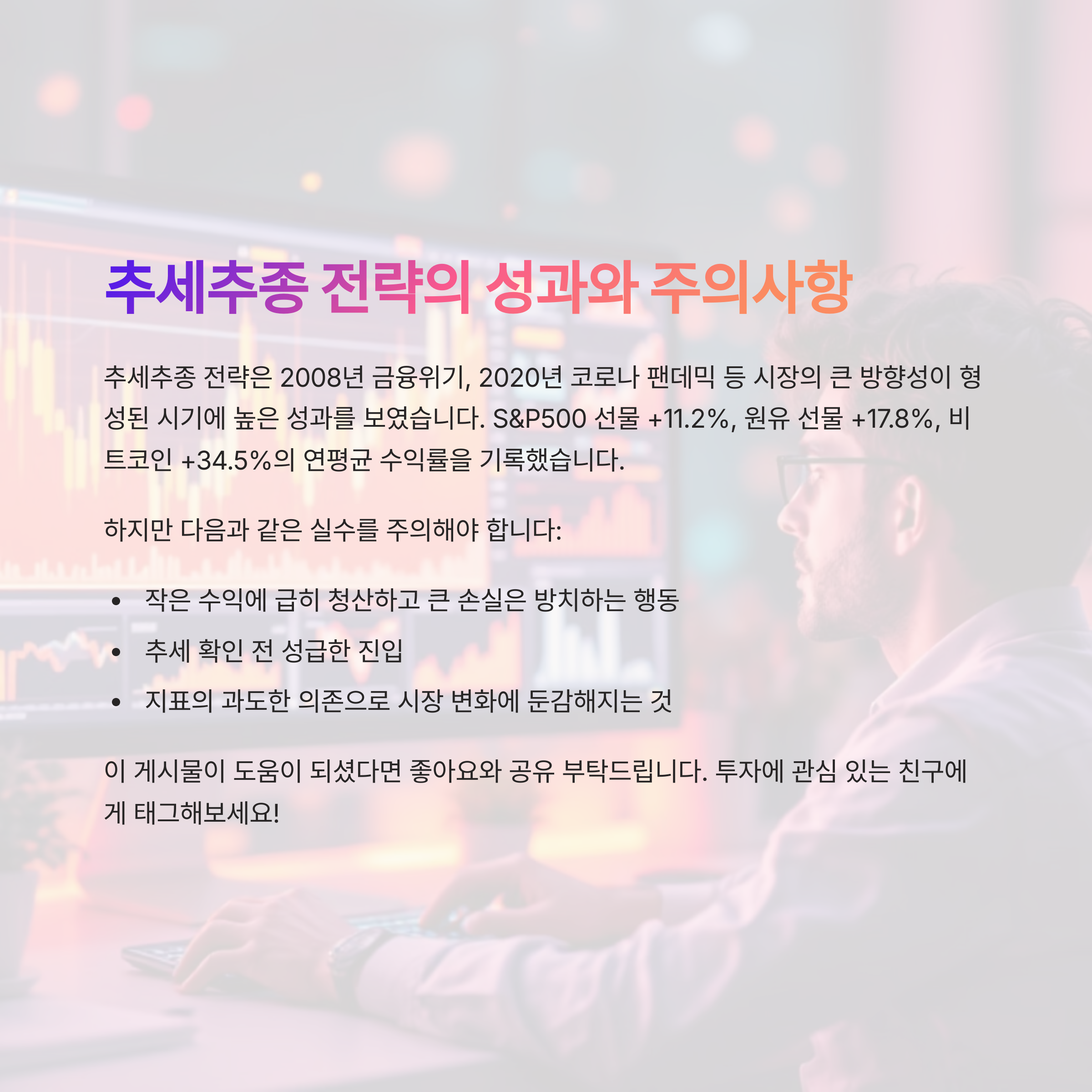 추세추종 전략은 단순해 보이지만 그 안에는 철저한 분석과 일관된 실행력이 뒷받침되어야만 성과를 낼 수 있는 전략입니다.