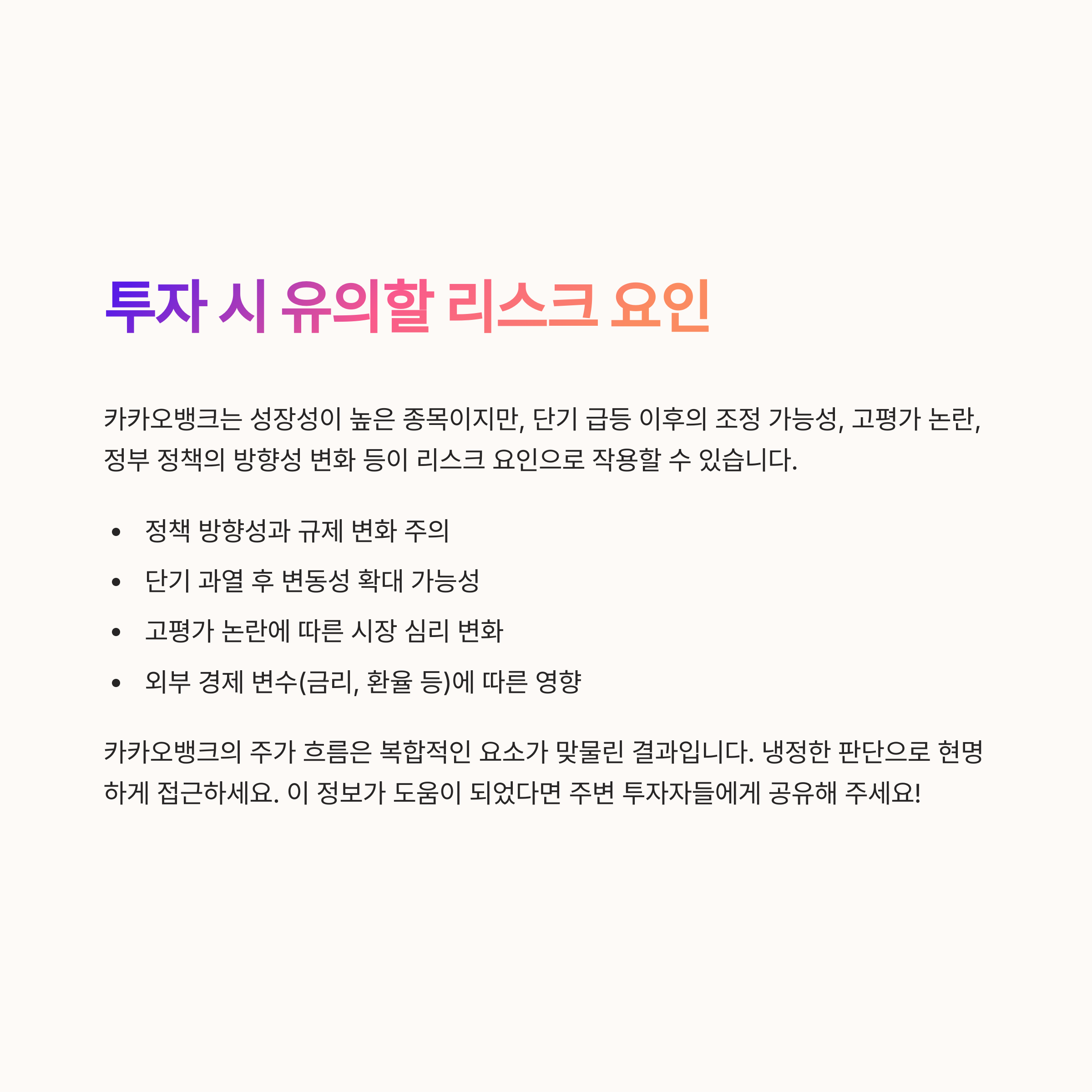 카카오뱅크는 성장성이 높은 종목이지만, 단기 급등 이후의 조정 가능성, 고평가 논란, 정부 정책의 방향성 변화 등이 리스크 요인으로 작용할 수 있습니다.