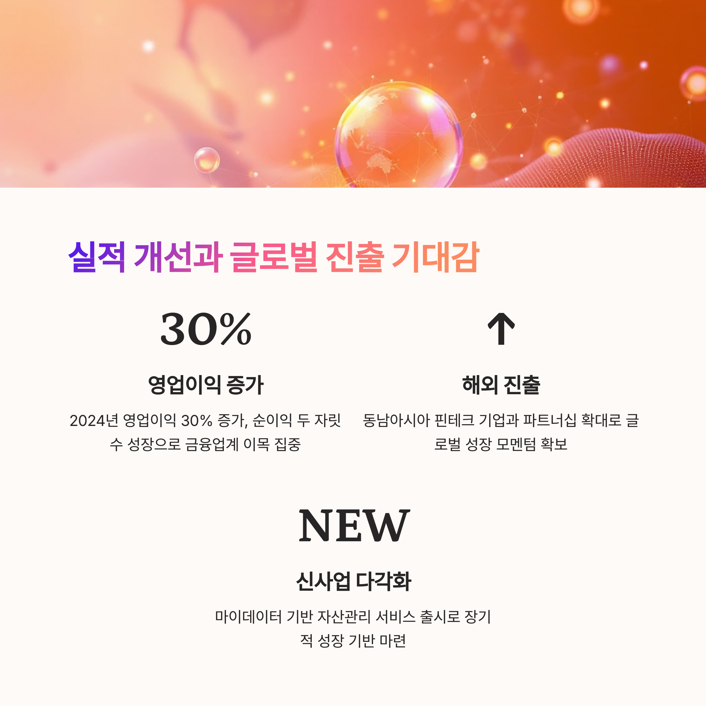 | 2024년 실적 | 영업이익 30% 증가, 순이익 두 자릿수 성장 |
