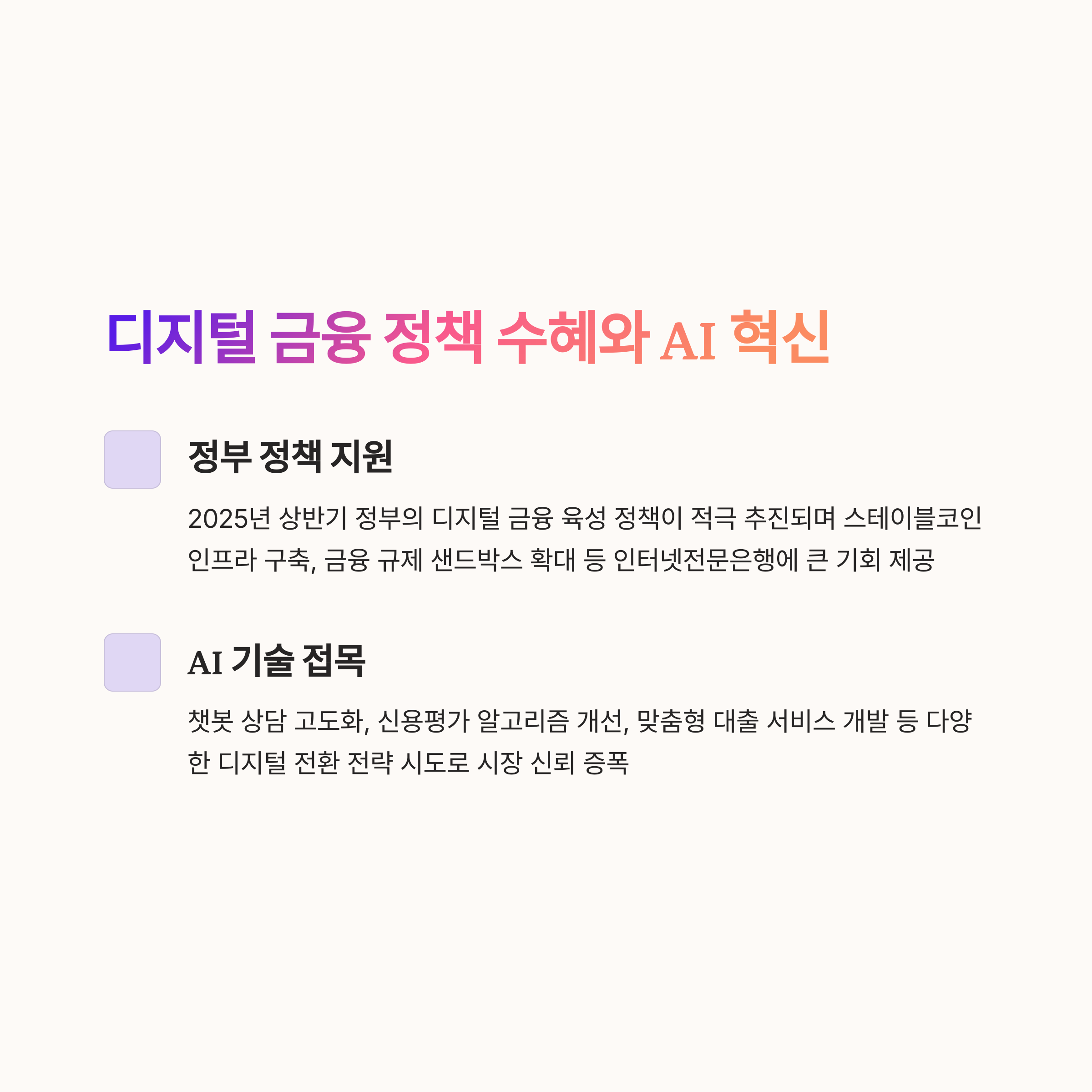 2025년 상반기 정부는 디지털 금융 육성 정책을 적극적으로 추진하며 카카오뱅크와 같은 인터넷전문은행에 큰 기회를 제공하고 있습니다.