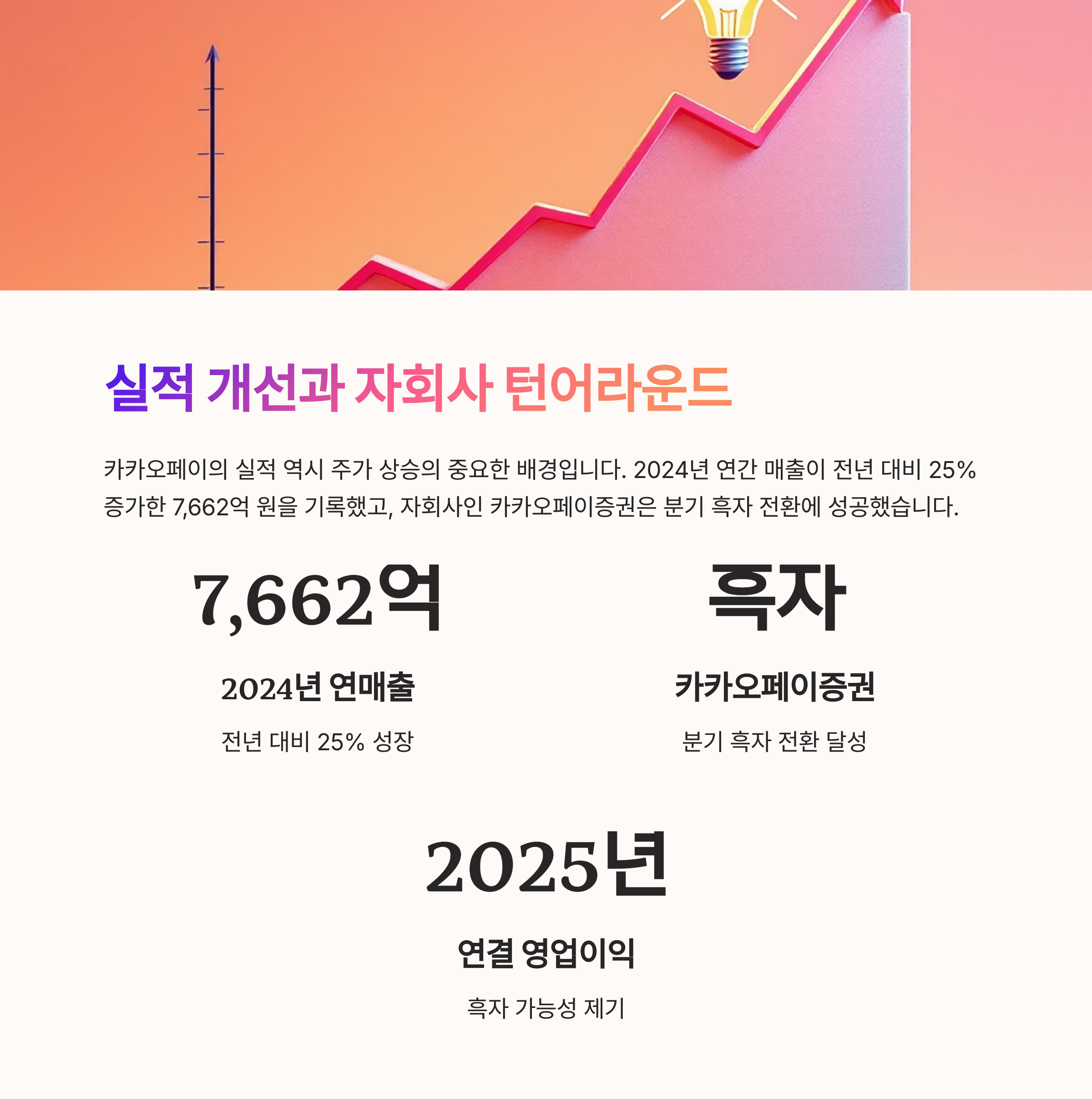 2024년 연간 매출이 전년 대비 25% 증가한 7,662억 원을 기록했고, 자회사인 카카오페이증권은 분기 흑자 전환에 성공했습니다. 이는 단기 실적뿐 아니라 중장기 성장에 대한 신뢰도를 높이는 요소로 작용하고 있습니다.