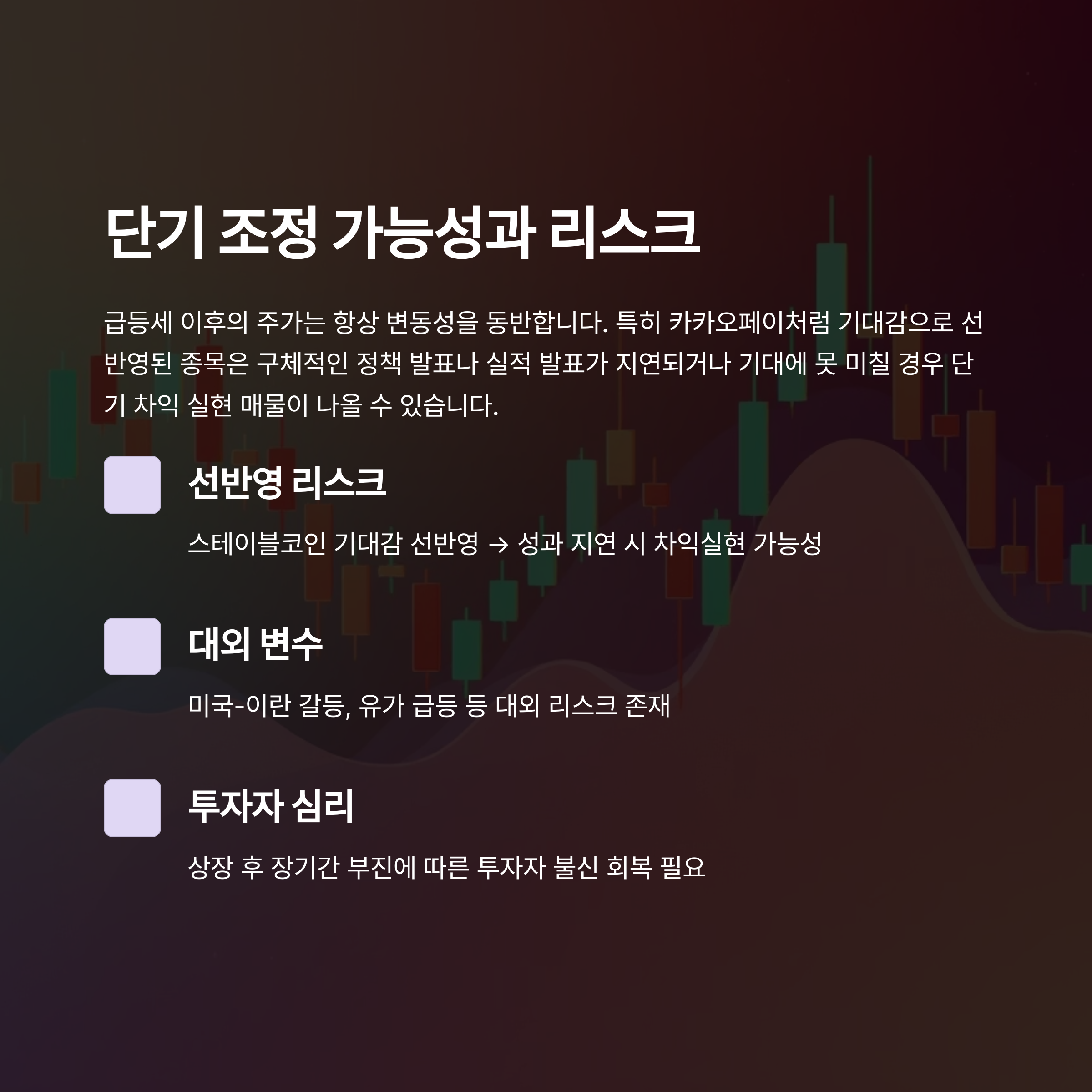 특히 카카오페이처럼 기대감으로 선반영된 종목은 구체적인 정책 발표나 실적 발표가 지연되거나 기대에 못 미칠 경우 단기 차익 실현 매물이 나올 수 있습니다.