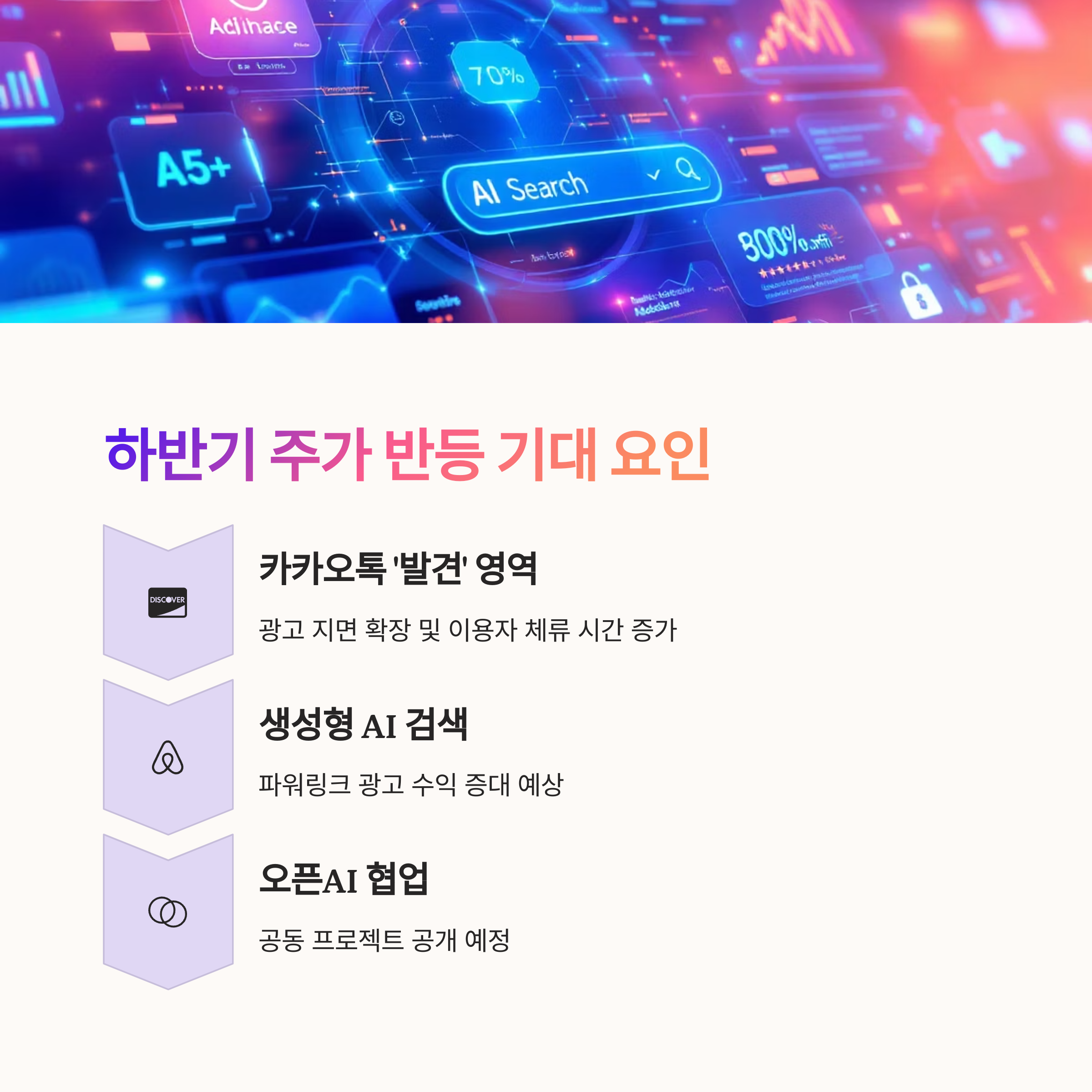 2025년 하반기에는 '발견 영역' 도입, 생성형 AI 검색 확장, 오픈AI 협업 등의 모멘텀이 본격화되며 주가에도 긍정적인 영향을 미칠 것으로 기대됩니다.