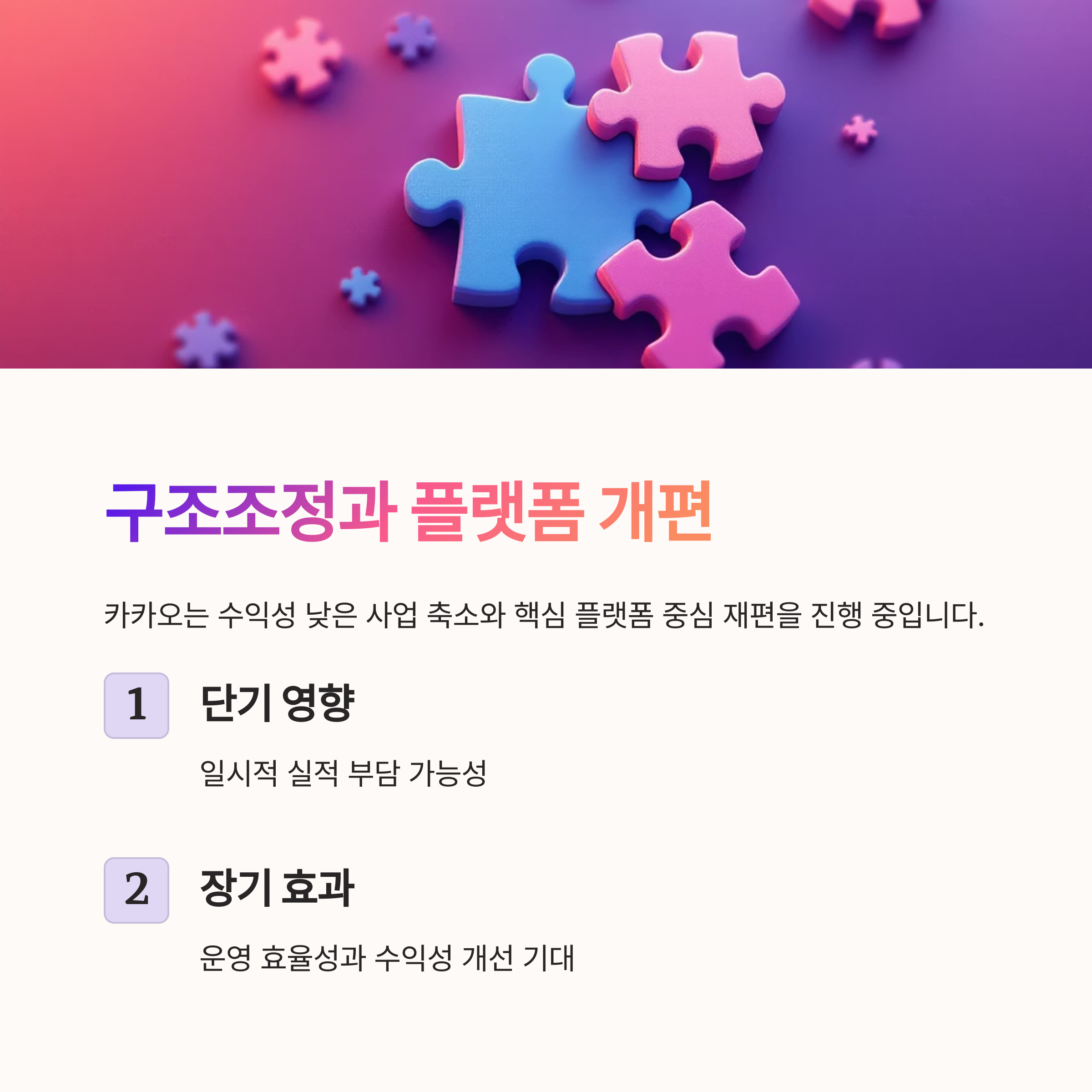 카카오는 현재 구조조정과 플랫폼 개편을 통해 수익성을 강화하는 한편, AI와 광고, 콘텐츠 중심의 신사업에 집중하며 새로운 성장 국면을 준비하고 있습니다.