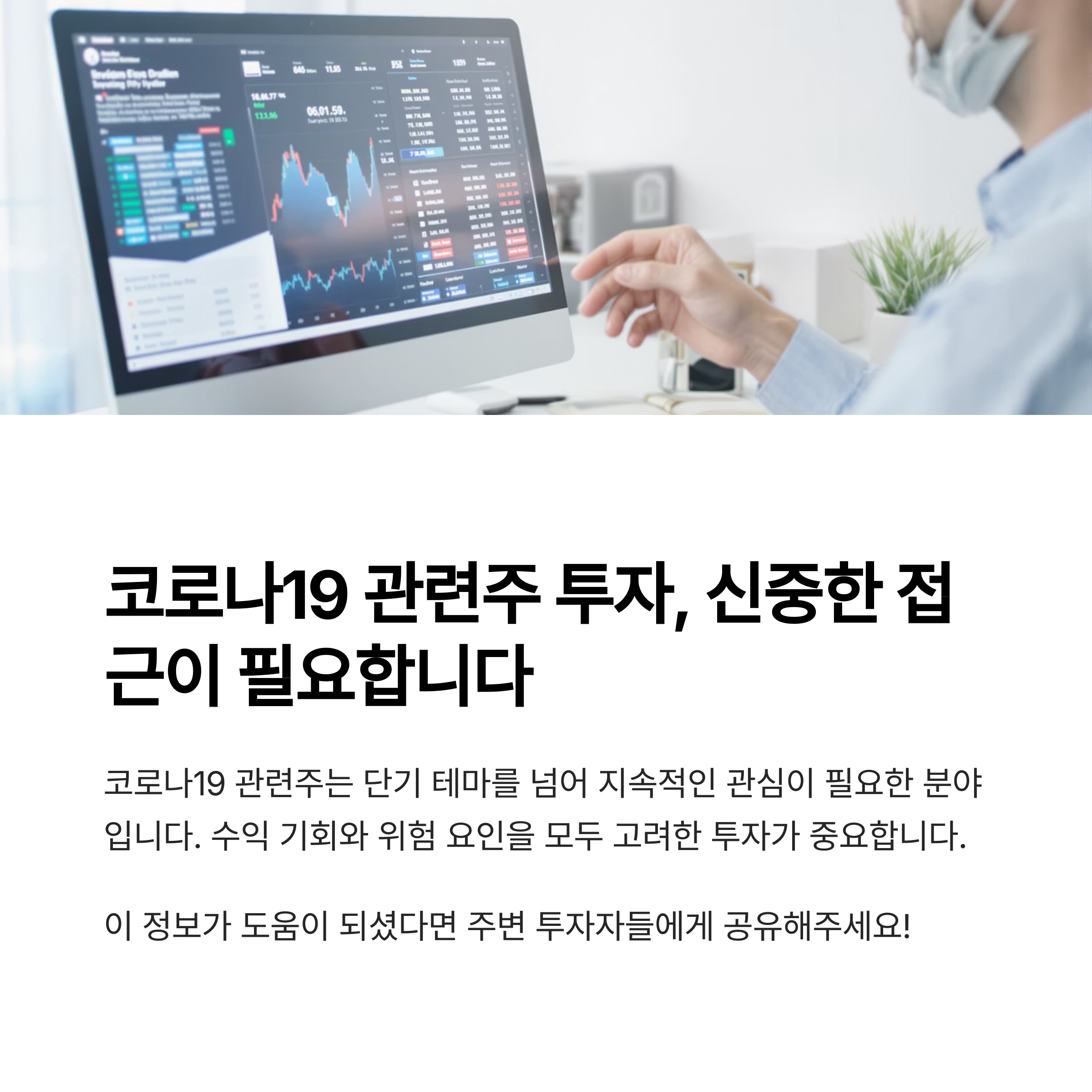 진단키트 및 백신 관련주는 빠르게 반응하는 테마주 특성을 가지고 있으며, 이는 곧 높은 변동성과 투자 위험으로 연결됩니다. 테마가 끝나면 주가가 급락하는 경우가 많으며, 신약개발 성공 여부나 긴급사용 승인 지연 등의 변수도 존재합니다.