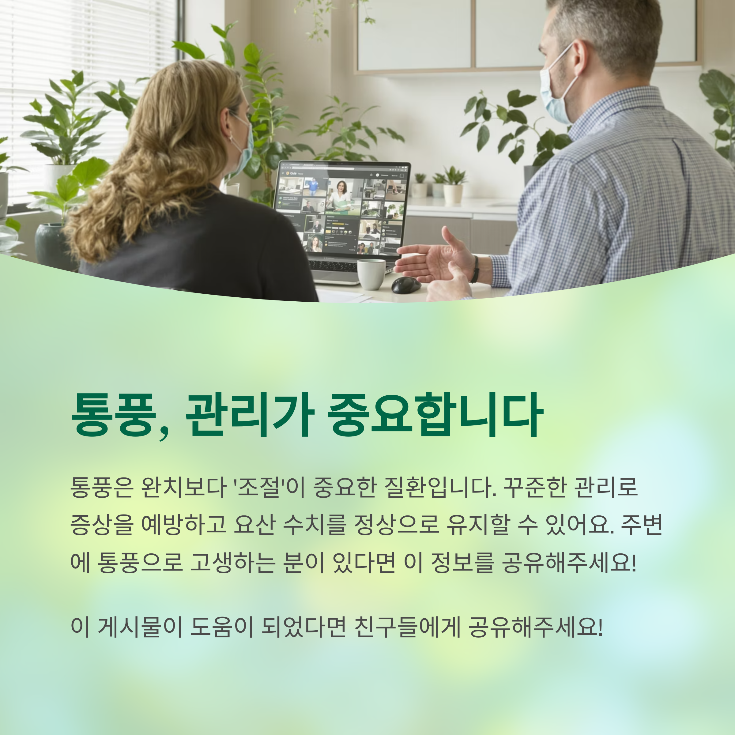 완치보다는 '조절'이 중요한 질환입니다. 꾸준한 관리로 증상을 예방하고 요산 수치를 정상으로 유지할 수 있어요.