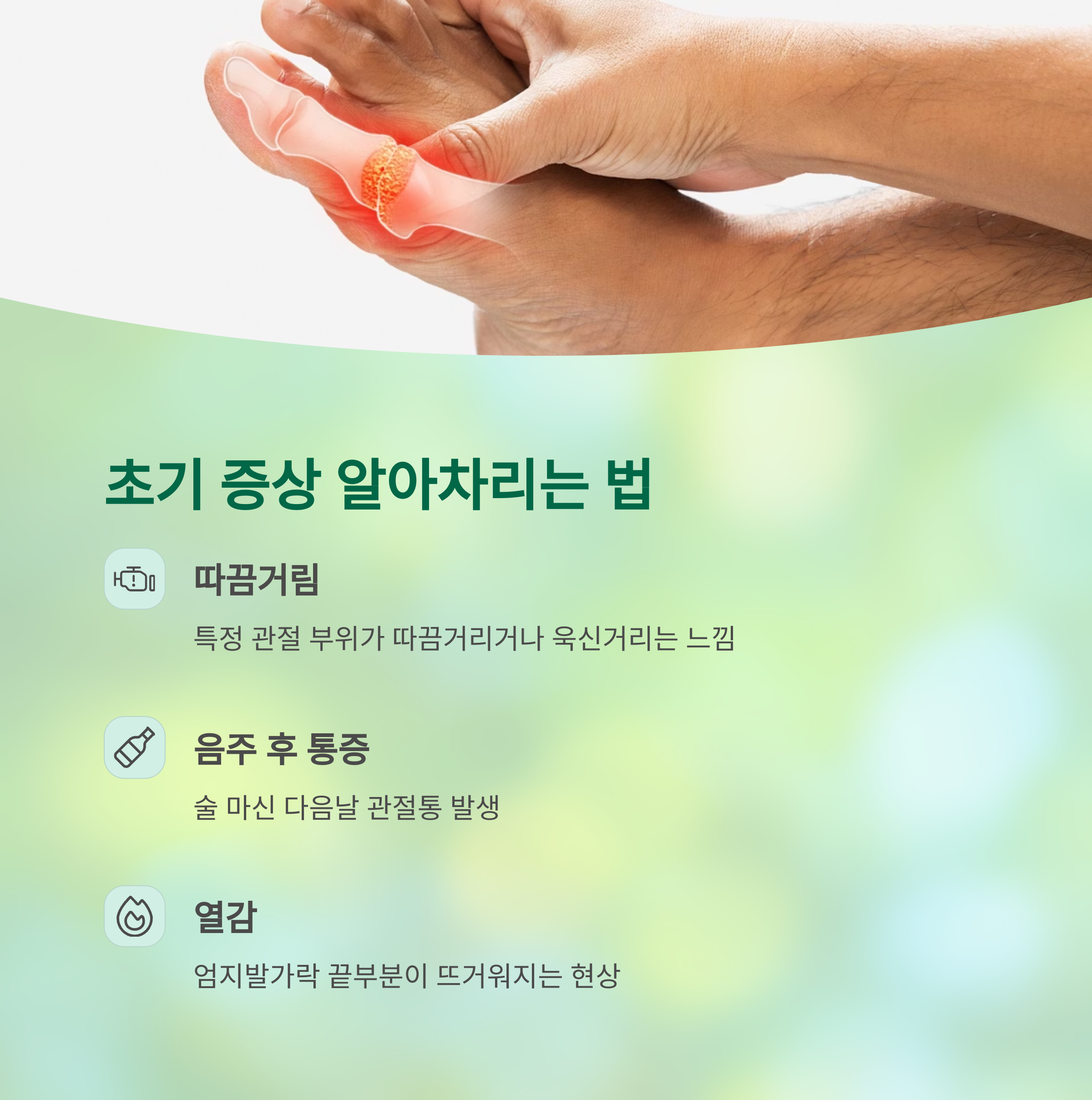 통풍은 초기에 알아차리기 쉽지 않지만, 몇 가지 신호를 주의 깊게 보면 조기 발견이 가능합니다. 특히 다음과 같은 증상이 반복된다면 의심해보세요.