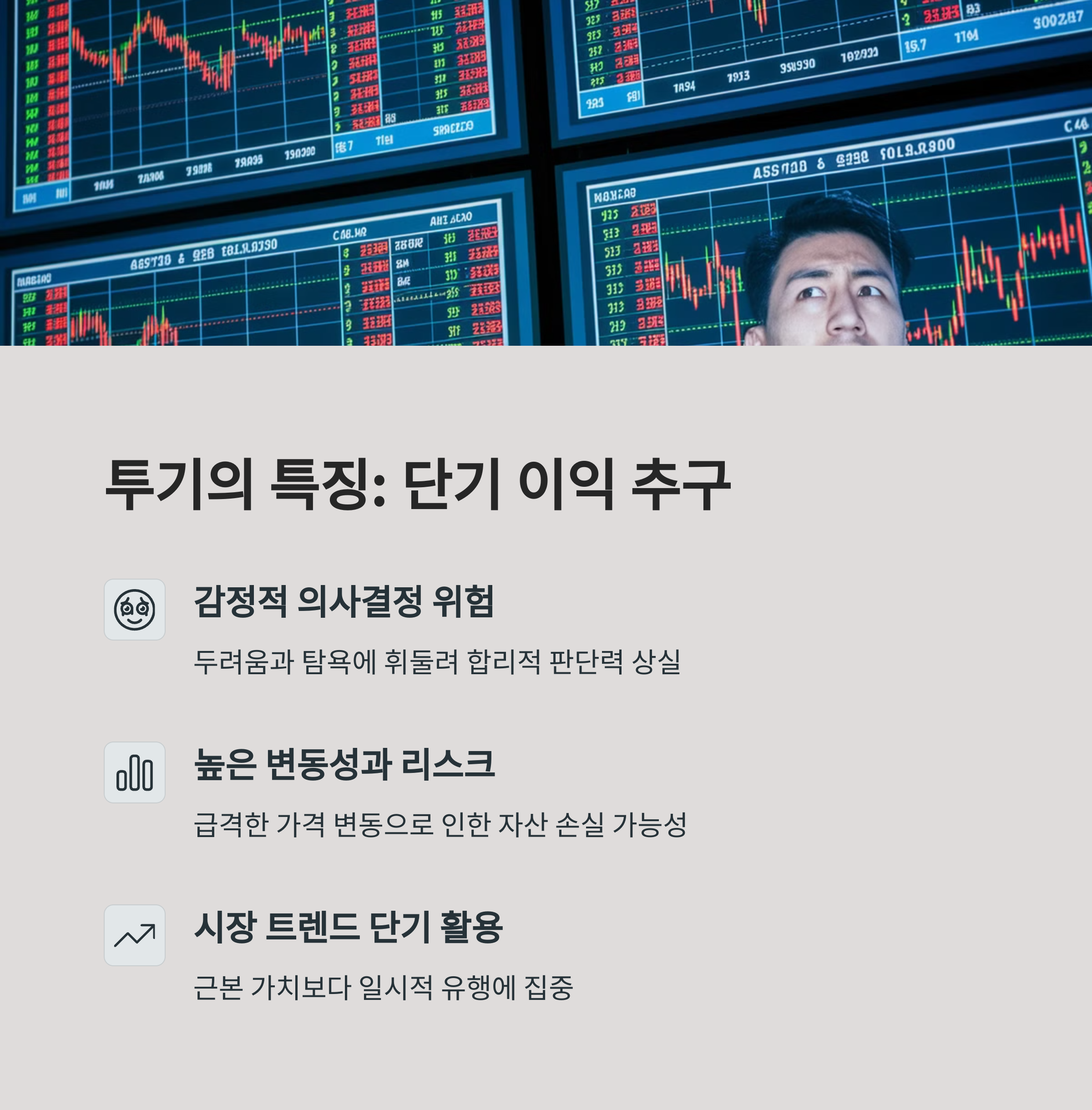 | 투기란 무엇인가 | 단기간 내 큰 수익을 노리는 고위험 고수익 전략입니다. |