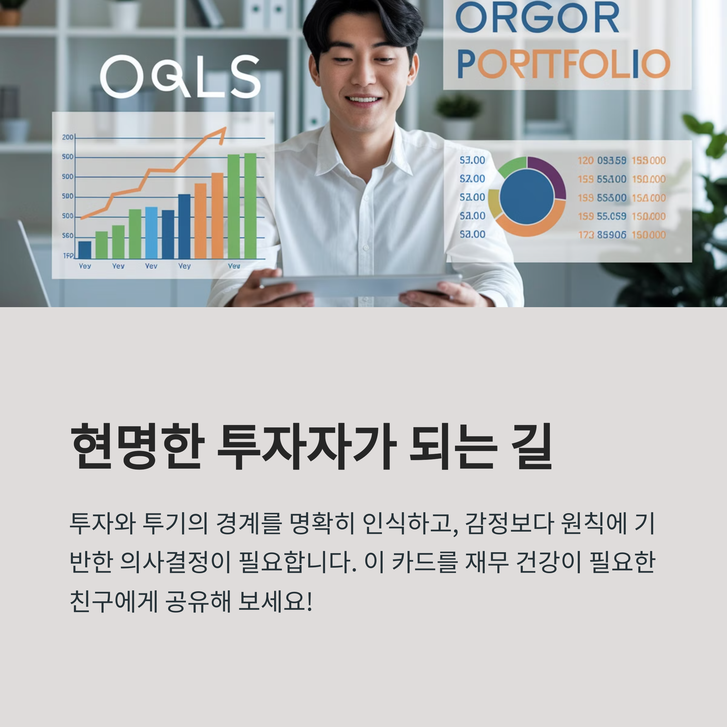 투자와 투기는 같은 금융행위처럼 보이지만, 근본적으로 다릅니다. 하나는 시간을 들여 자산의 가치를 쌓아가는 전략이며, 다른 하나는 빠른 수익을 위한 위험한 선택일 수 있습니다. 성공적인 자산 관리를 위해서는 본인이 추구하는 방향이 어디를 향하고 있는지 스스로 점검해야 합니다. 감정이 아닌 논리, 유행이 아닌 원칙을 따를 때 우리는 보다 지속 가능한 부를 이룰 수 있습니다. 오늘의 선택이 내일의 결과를 만듭니다. 올바른 방향으로 나아가 보세요.