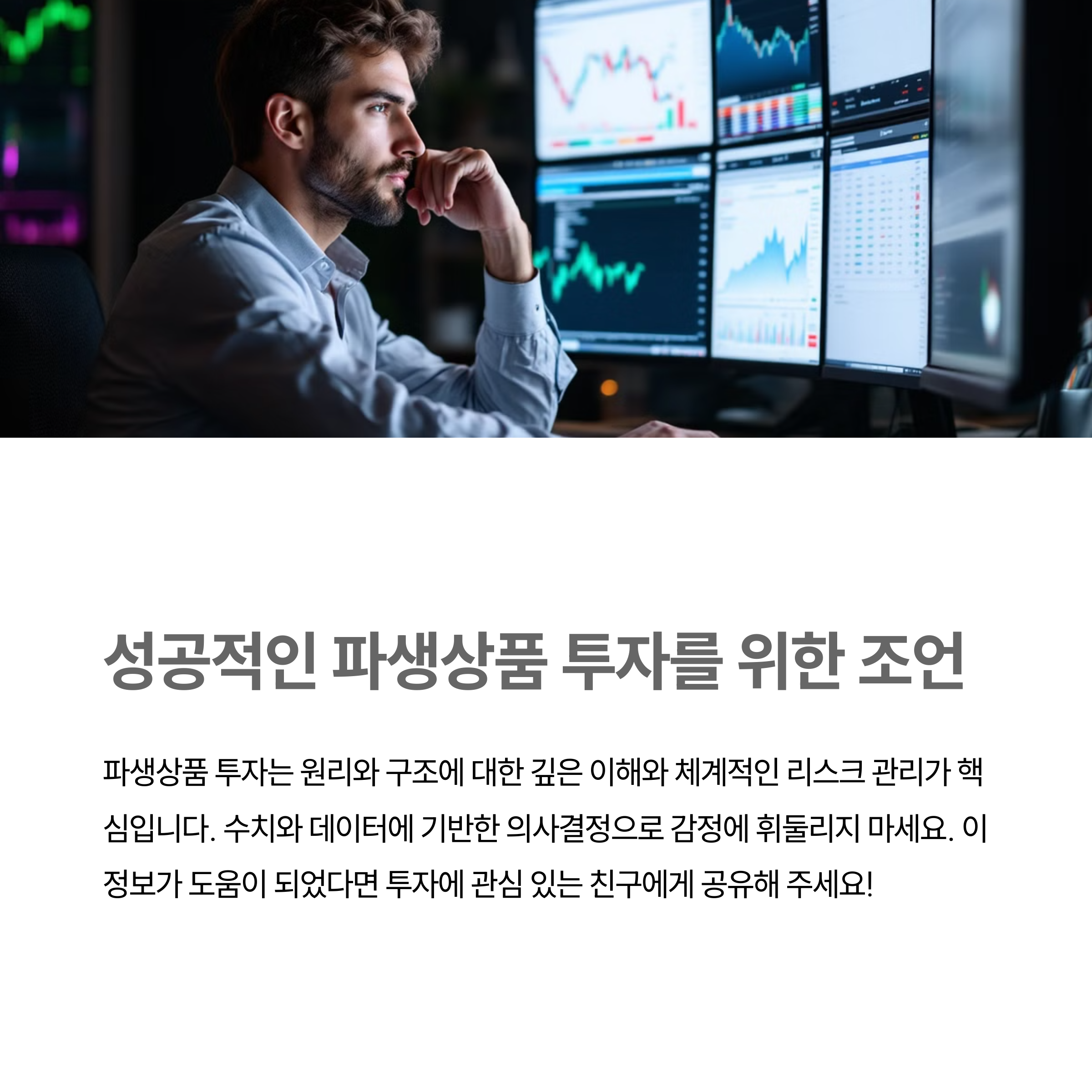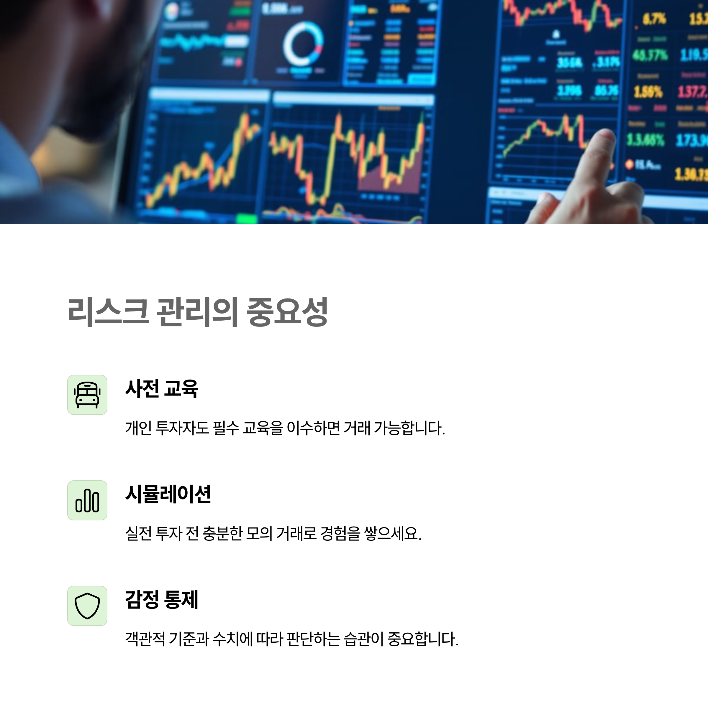 개인 투자자들이 파생상품을 접할 때 가장 먼저 느끼는 것은 어렵고 복잡하다는 인식입니다. 하지만 기본적인 개념만 정확히 이해하면, 오히려 리스크를 관리하는 수단으로도 활용할 수 있습니다. 특히 하락장에서는 공매도나 옵션 전략을 활용해 손실을 줄이는 역할도 하죠. 중요한 것은 감이 아닌 기준입니다. 자신의 투자 스타일과 리스크 선호도에 따라 파생상품의 종류와 전략을 선택해야 하며, 절대 무작정 진입해서는 안 됩니다.
