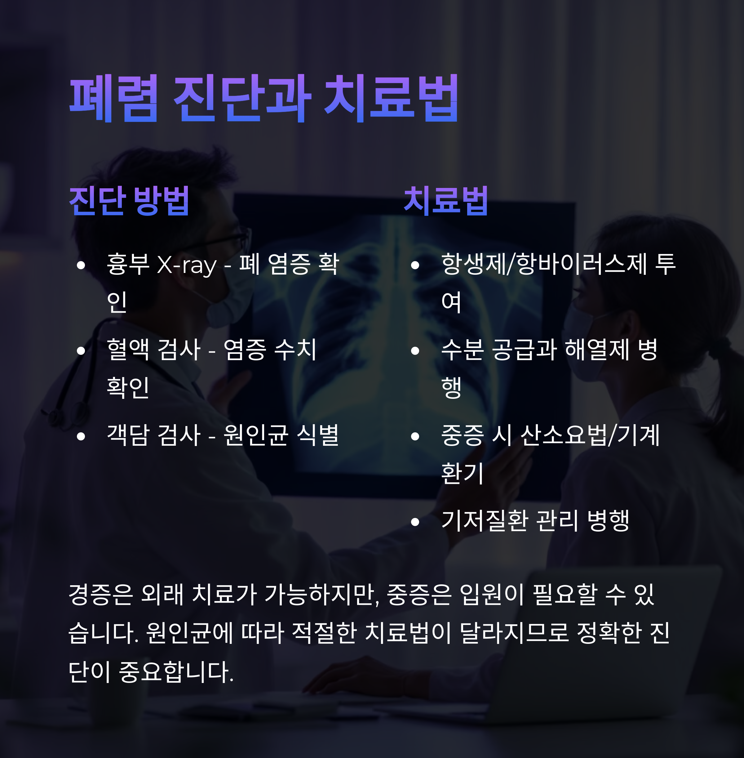 폐렴은 폐에 염증이 생기는 질환으로 감기보다 증상이 심하고 고열, 흉통, 호흡곤란 등이 동반됩니다.