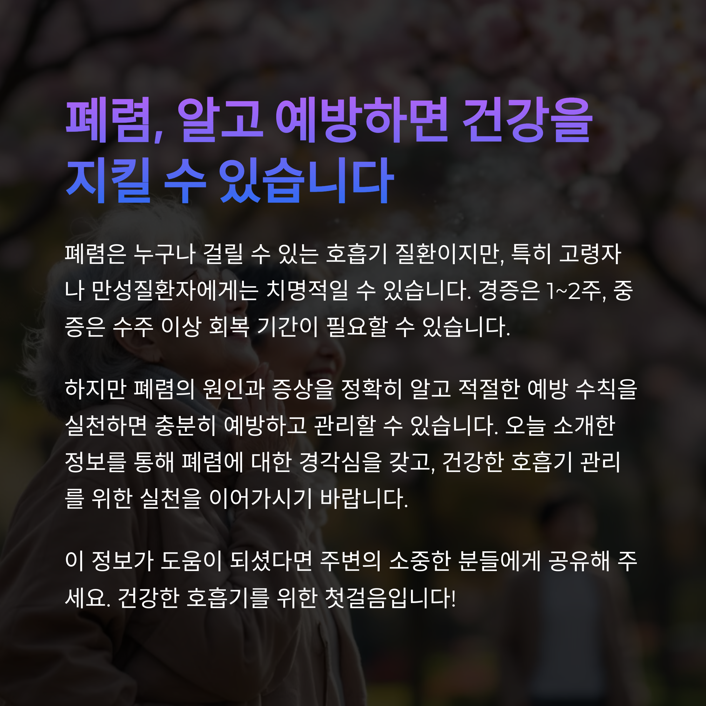 폐렴은 누구나 걸릴 수 있는 호흡기 질환이며, 특히 고령자나 만성질환자에게는 치명적일 수 있습니다.