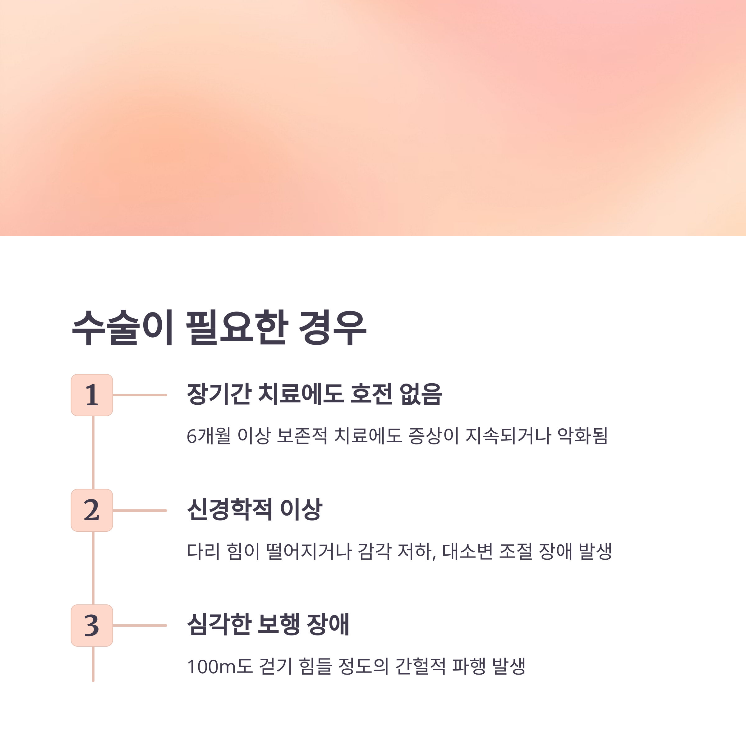 수술은 최후의 수단입니다. 대부분의 환자는 비수술 치료로도 증상이 개선되지만, 아래와 같은 경우에는 수술을 고려해야 할 수도 있어요. 특히 걷는 게 점점 더 힘들어진다거나, 대소변 기능에 문제가 생기면 신경이 심각하게 눌리고 있는 상황일 수 있거든요.
