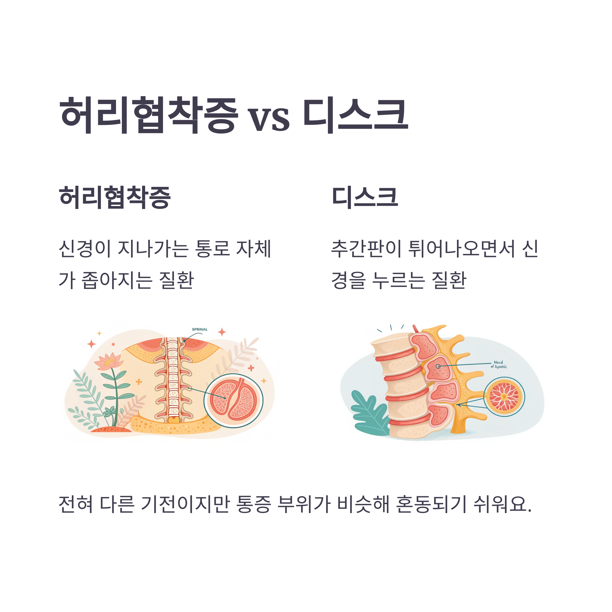 디스크는 추간판이 튀어나오면서 신경을 누르는 병이고, 협착증은 신경이 지나가는 통로 자체가 좁아지는 병입니다.