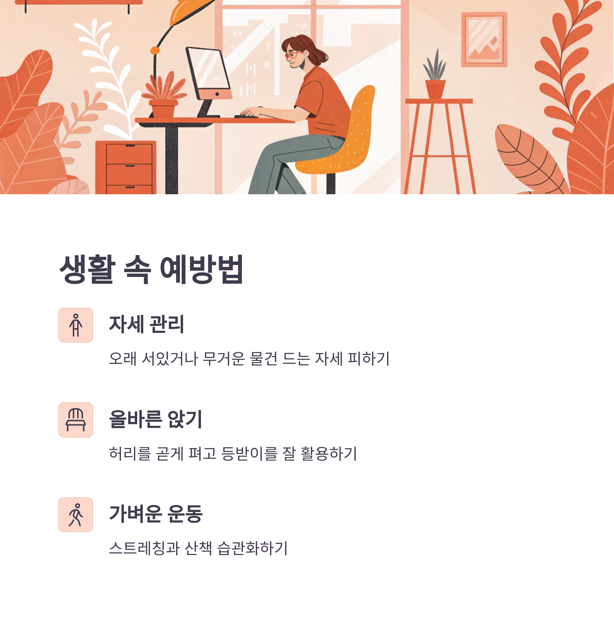 허리협착증은 완전히 예방할 수는 없지만, 생활 습관을 잘 관리하면 발병 위험을 줄이거나 통증을 줄일 수 있어요. 특히 아래 방법들은 일상생활에서 실천 가능하면서도 효과적인 것들이랍니다.
