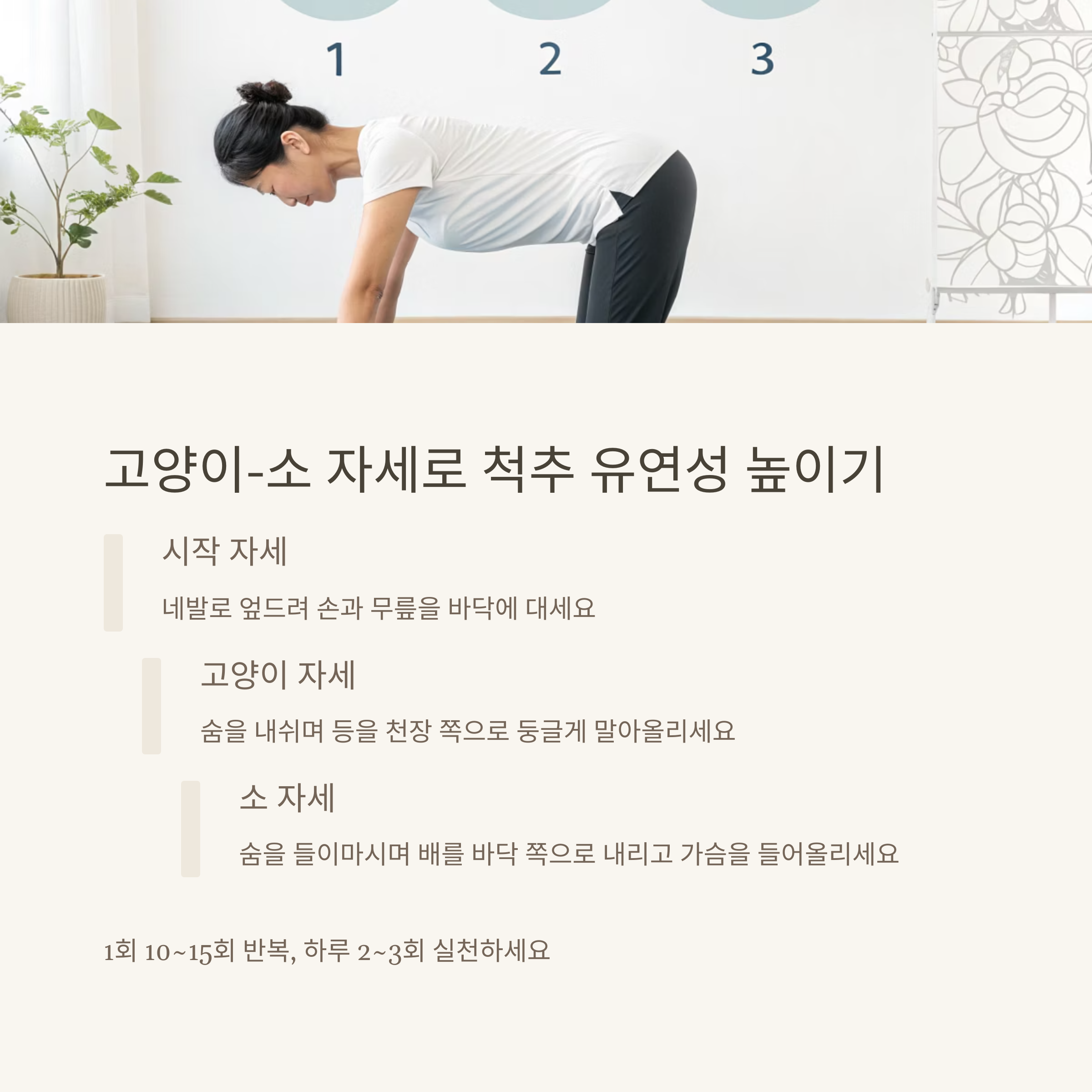 지인은 물리치료 중 배운 ‘고양이-소 자세’를 꾸준히 따라하며 척추의 유연성을 회복했다고 전했습니다. 이 자세는 척추를 부드럽게 움직여주며, 신경의 압박을 줄이는 데 효과적입니다. 천천히 호흡을 맞추며 10회씩 하루 3세트 반복하는 것이 좋다고 합니다.