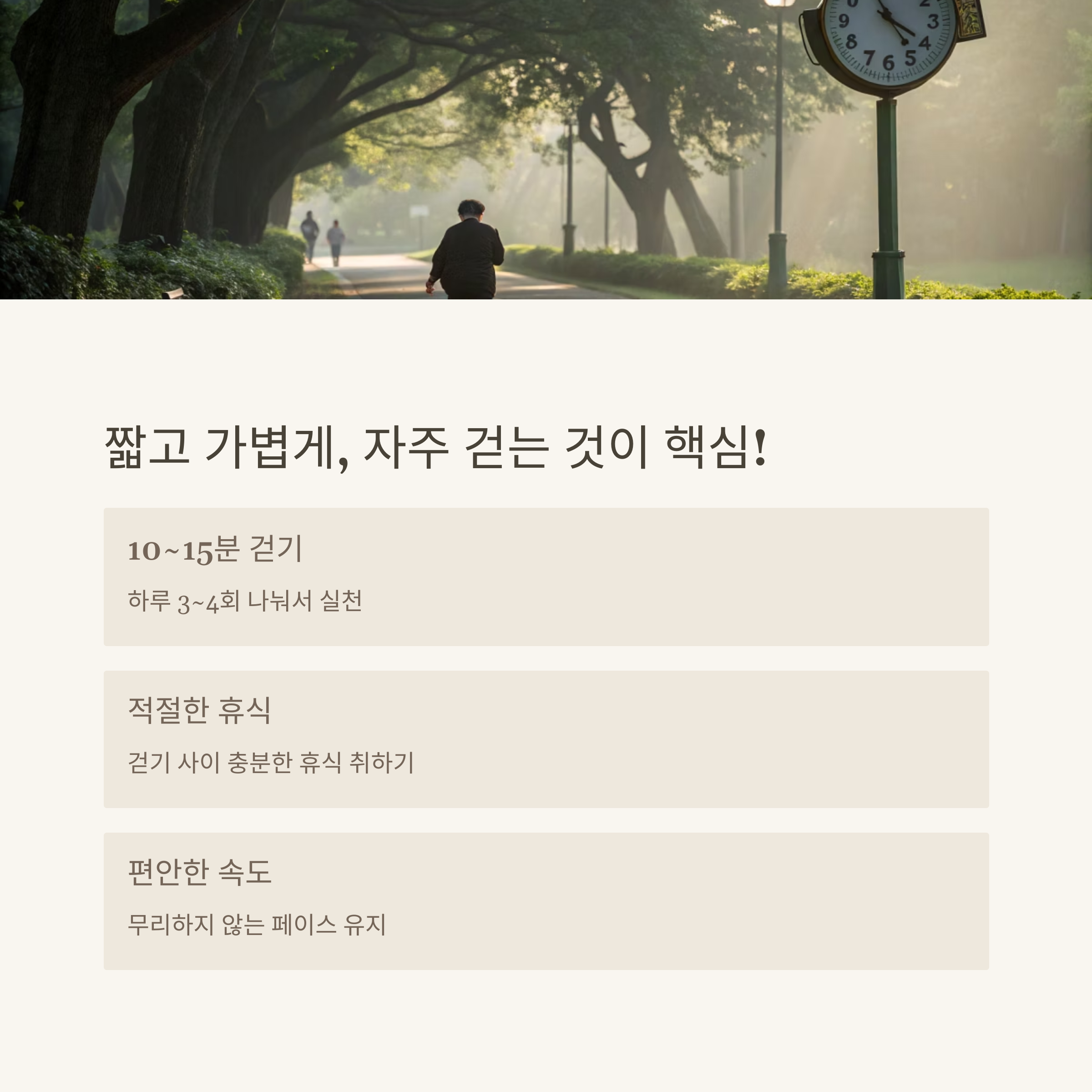 통증이 느껴질 정도라면 걷기 방식이나 강도를 재조정해야 합니다. 짧은 시간, 느린 속도, 자주 걷는 방식으로 바꾸는 것이 좋습니다.