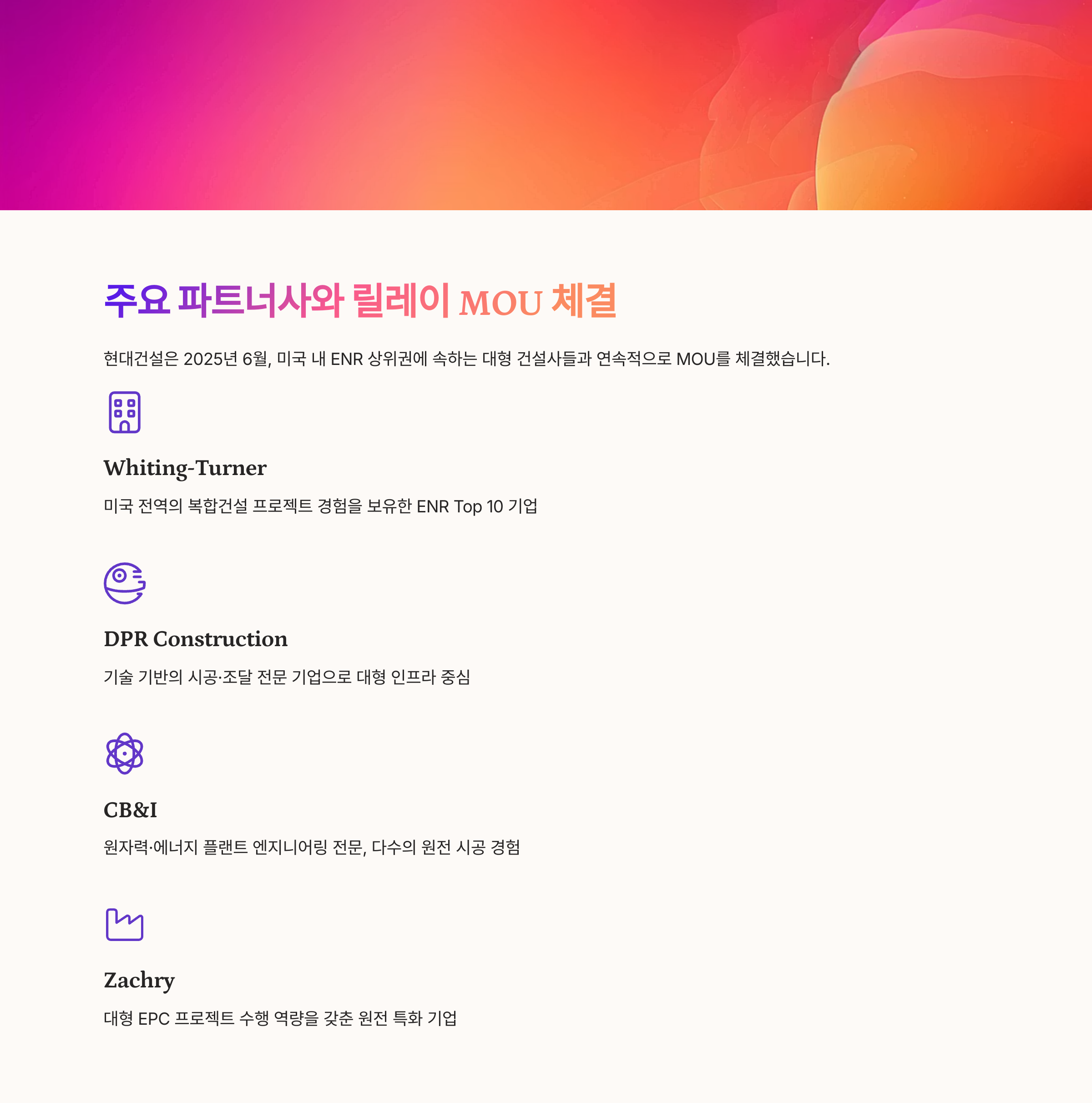 파트너사들은 미국 내 ENR(Engineering News-Record) 상위권에 속하는 대형 기업들로 구성되어 있으며, 각각 원전 및 복합 플랜트 시공에 강점을 지닌 기업들입니다.