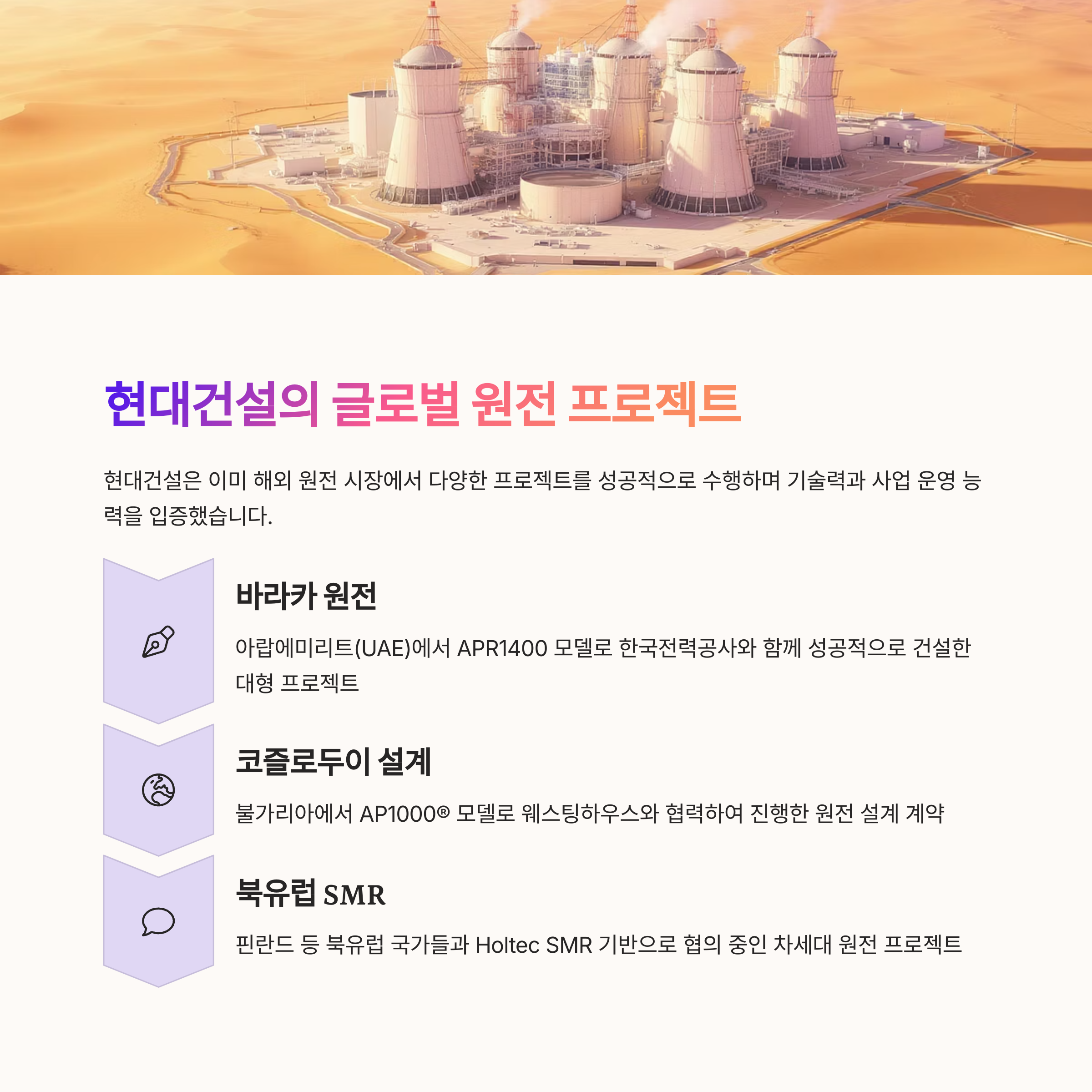 실제로 현대건설은 이미 중동과 유럽에서 원전 프로젝트를 수행하며 기술력과 신뢰를 입증해왔습니다.