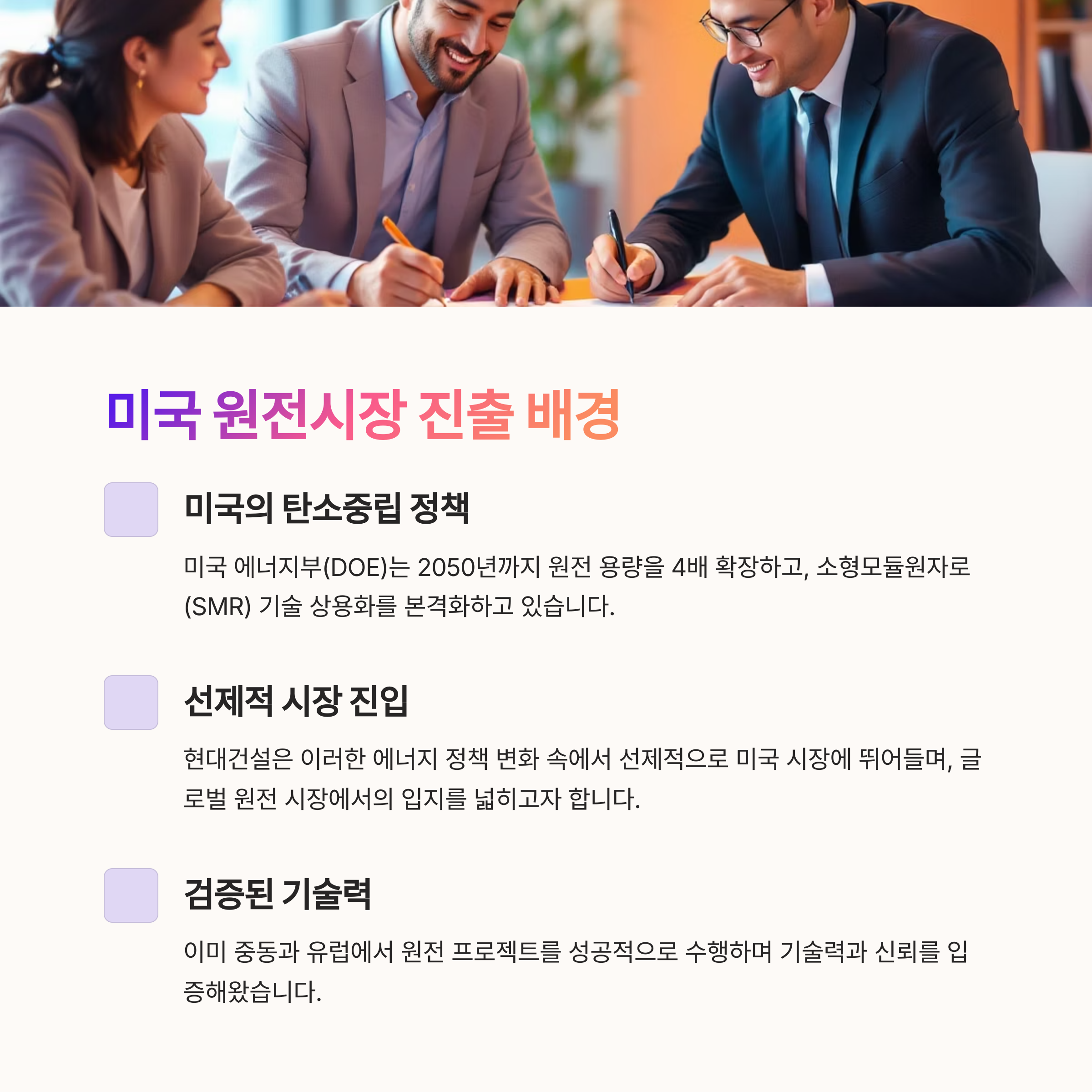 현대건설의 미국 원전시장 진입은 단순한 수주 차원을 넘어, 한국 원전 기술의 글로벌 신뢰도를 반영하는 상징적 사례로 해석되고 있습니다.