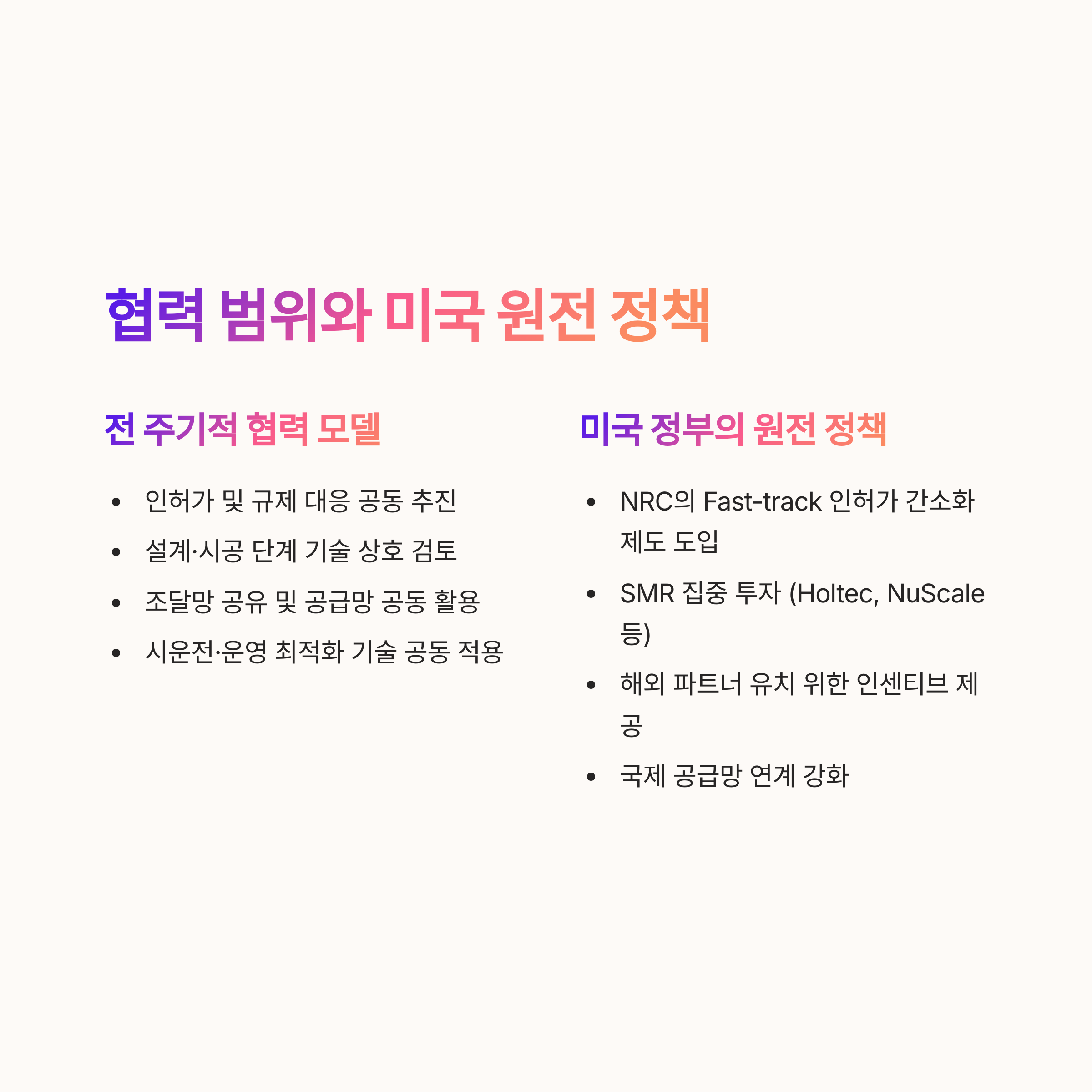 | SMR 집중 투자 | Holtec, NuScale 등과의 R&D 예산 배정 |