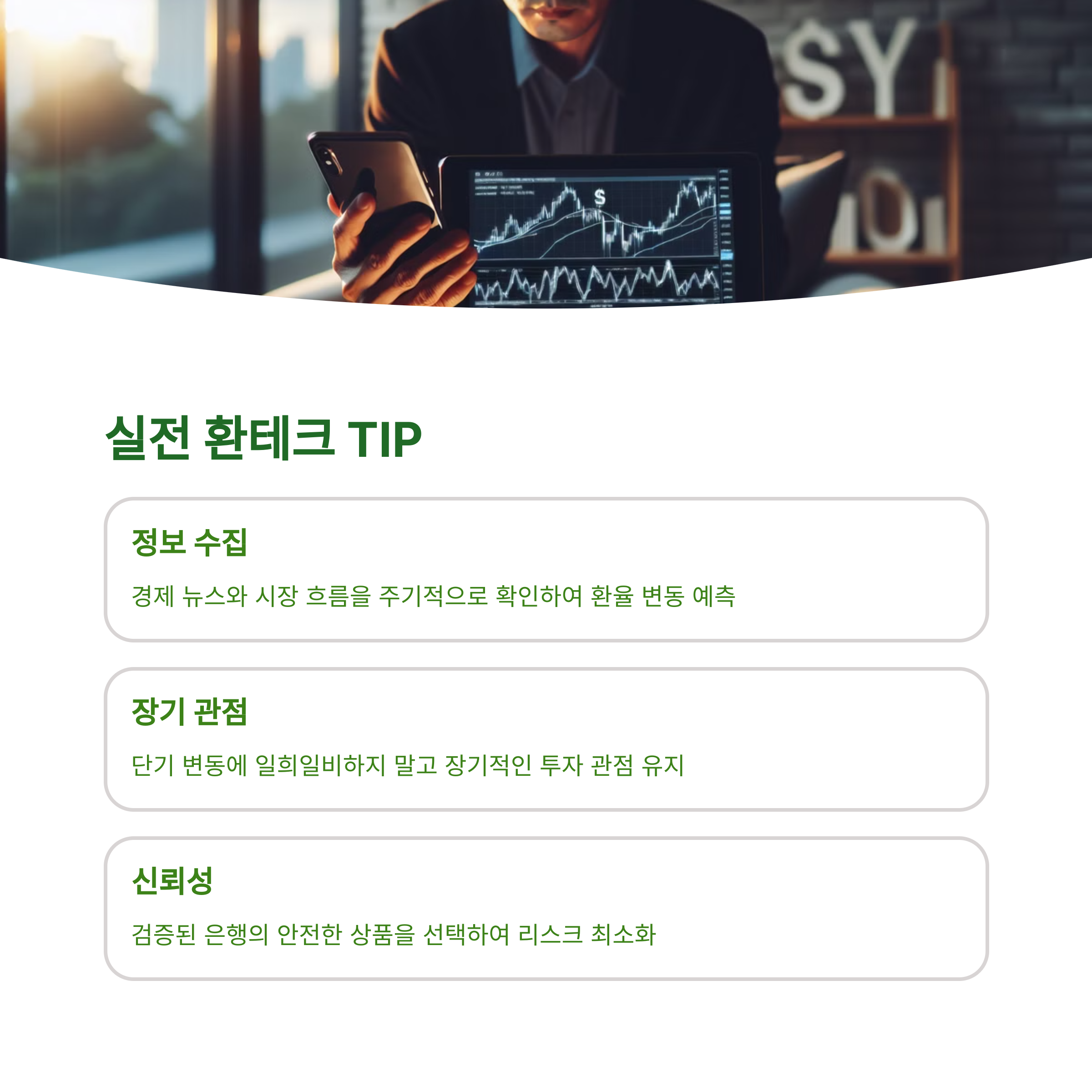 모든 금융상품이 그러하듯, 환테크도 환율 변동에 따른 손실 가능성이 있습니다. 소액 분산 투자로 시작해 경험을 쌓는 것이 안전합니다.