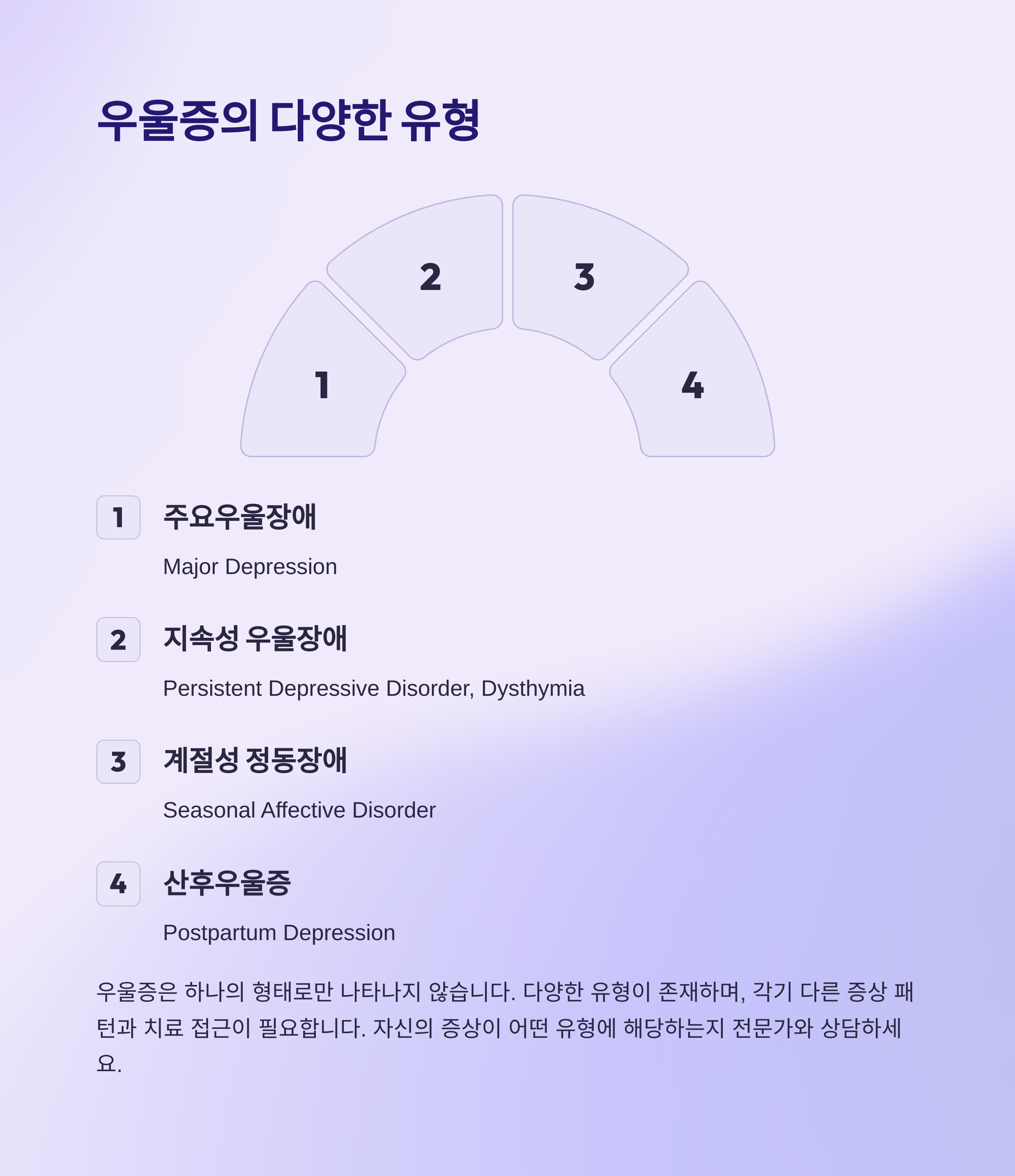 우울증은 하나의 형태로만 나타나지 않습니다. 다양한 유형이 존재하며, 각기 다른 증상 패턴과 치료 접근이 필요합니다.