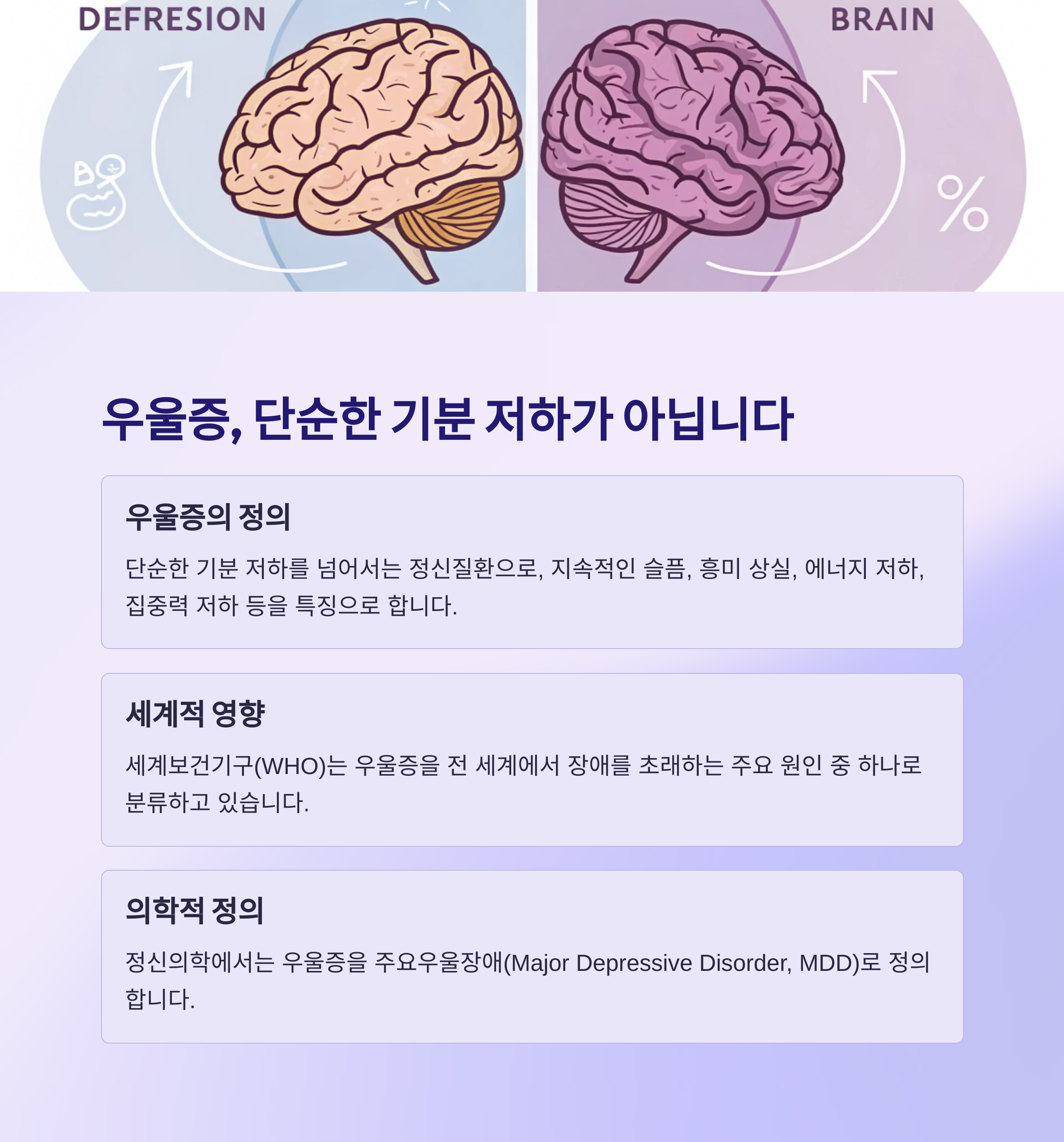 우울증은 단순한 기분 저하를 넘어서는 정신질환으로, 지속적인 슬픔, 흥미 상실, 에너지 저하, 집중력 저하 등을 특징으로 합니다. 세계보건기구(WHO)는 우울증을 전 세계에서 장애를 초래하는 주요 원인 중 하나로 분류하고 있으며,