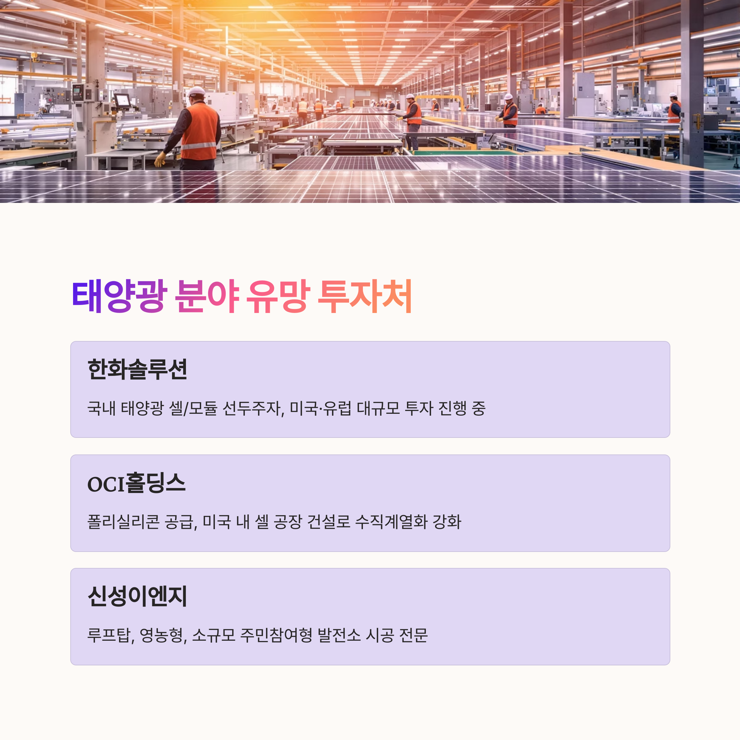 특히 신성이엔지, SDN과 같은 중소형 태양광 기업들이 지역 밀착형 사업을 주도하고 있습니다.