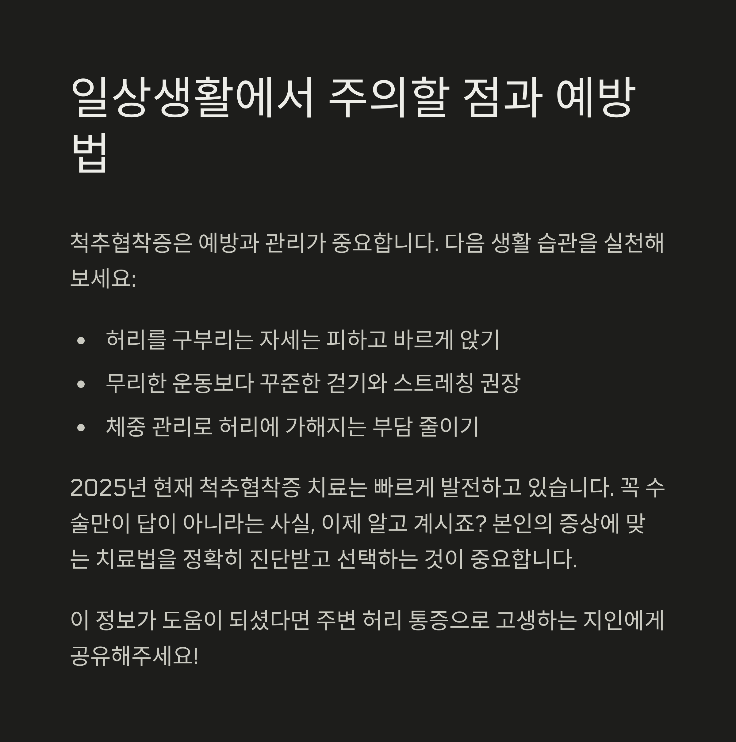 무엇보다 평소 자세와 생활습관 관리가 예방의 핵심이니, 이번 글을 통해 작은 실천 하나라도 시작해보셨으면 합니다.