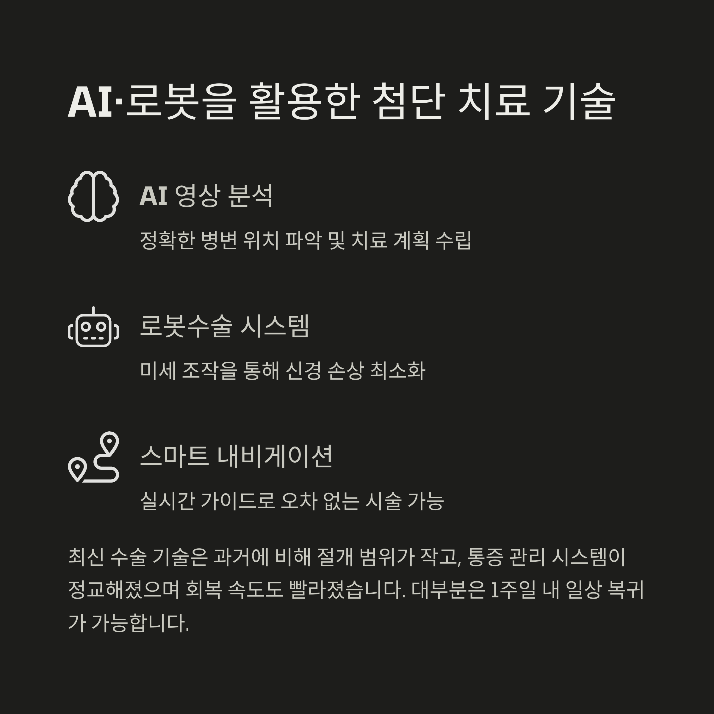 꼭 수술만이 답이 아니라는 사실, 이제는 많은 분들이 알고 계시죠. 비수술적 접근부터 첨단 기술을 활용한 로봇 수술까지 다양한 옵션이 존재하는 만큼, 본인의 증상에 맞는 치료법을 정확히 진단받고 선택하는 것이 중요합니다.