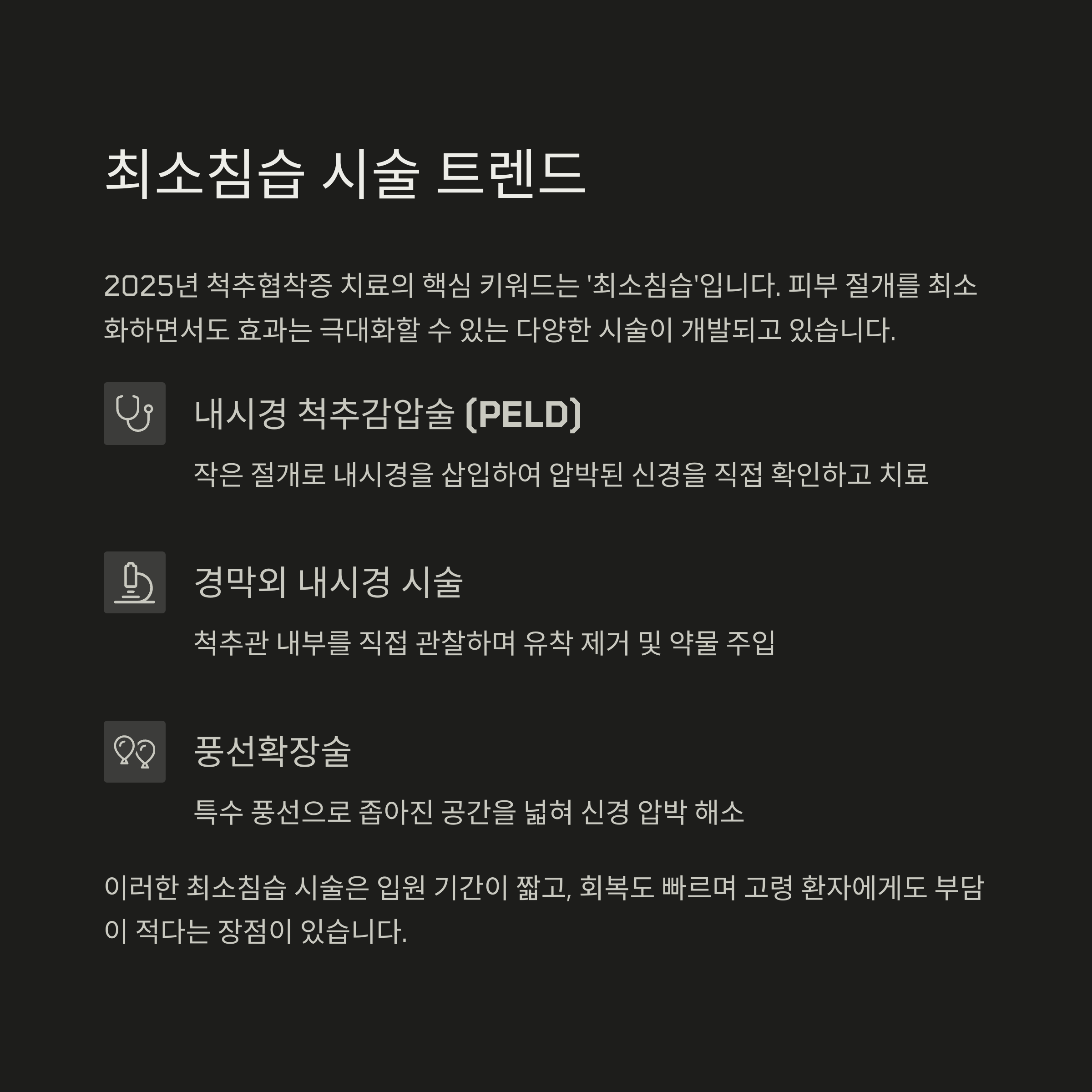 2025년 현재 척추협착증 치료의 핵심 키워드는 ‘최소침습’입니다.