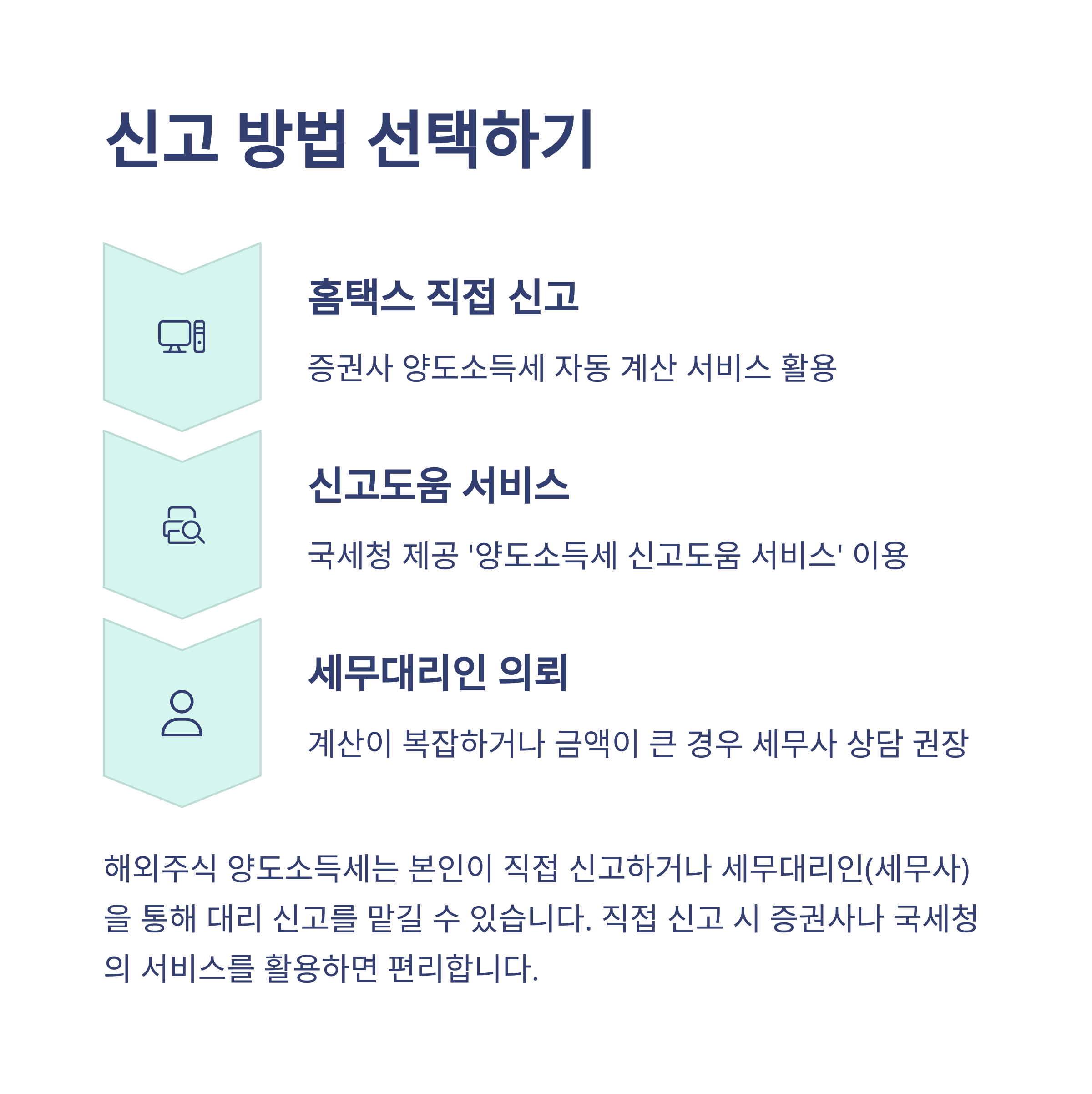 직접 신고 시에는 증권사에서 제공하는 양도소득세 자동 계산 서비스나 국세청 제공의 ‘양도소득세 신고도움 서비스’를 활용하면 편리합니다. 다만 계산이 복잡하거나 금액이 큰 경우에는 세무사 상담을 권장합니다.