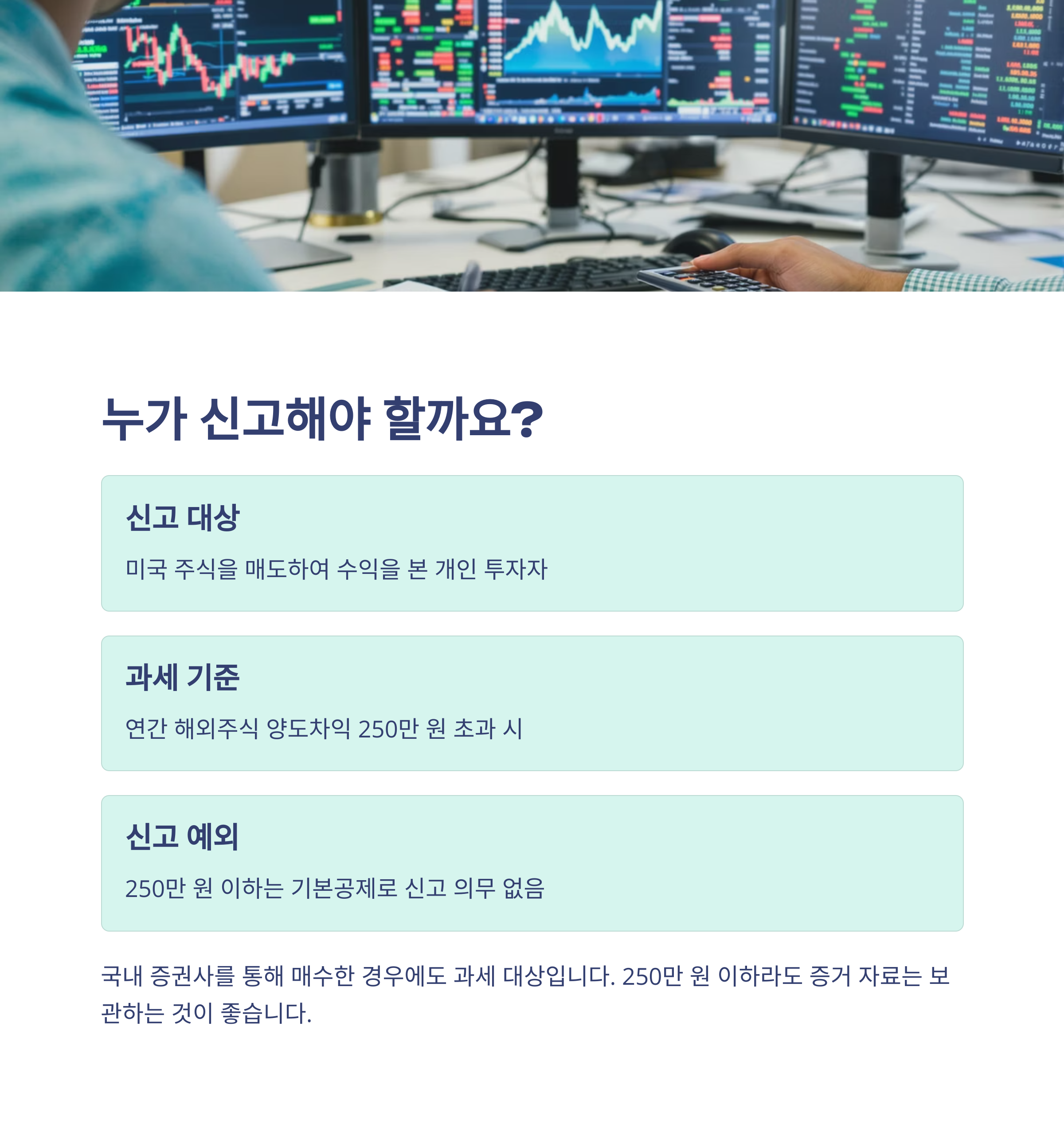 단, 연간 해외주식 양도차익이 250만 원을 초과할 경우에만 과세되며, 그 이하라면 기본공제 적용으로 신고 의무는 없지만 증거 자료는 보관하는 것이 좋습니다.