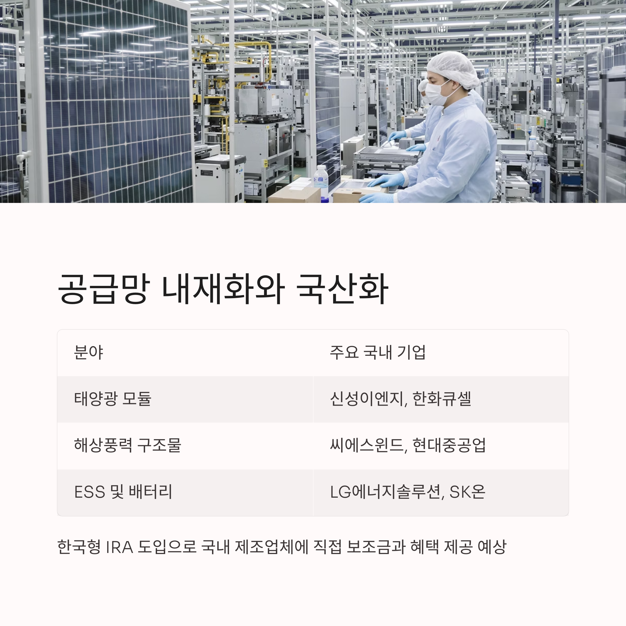 태양광 모듈, 해상풍력 부품, 배터리 셀 등 주요 재생에너지 부품의 국내 생산 업체들이 정부 보조금 수혜와 함께 경쟁력을 확보하게 됩니다.