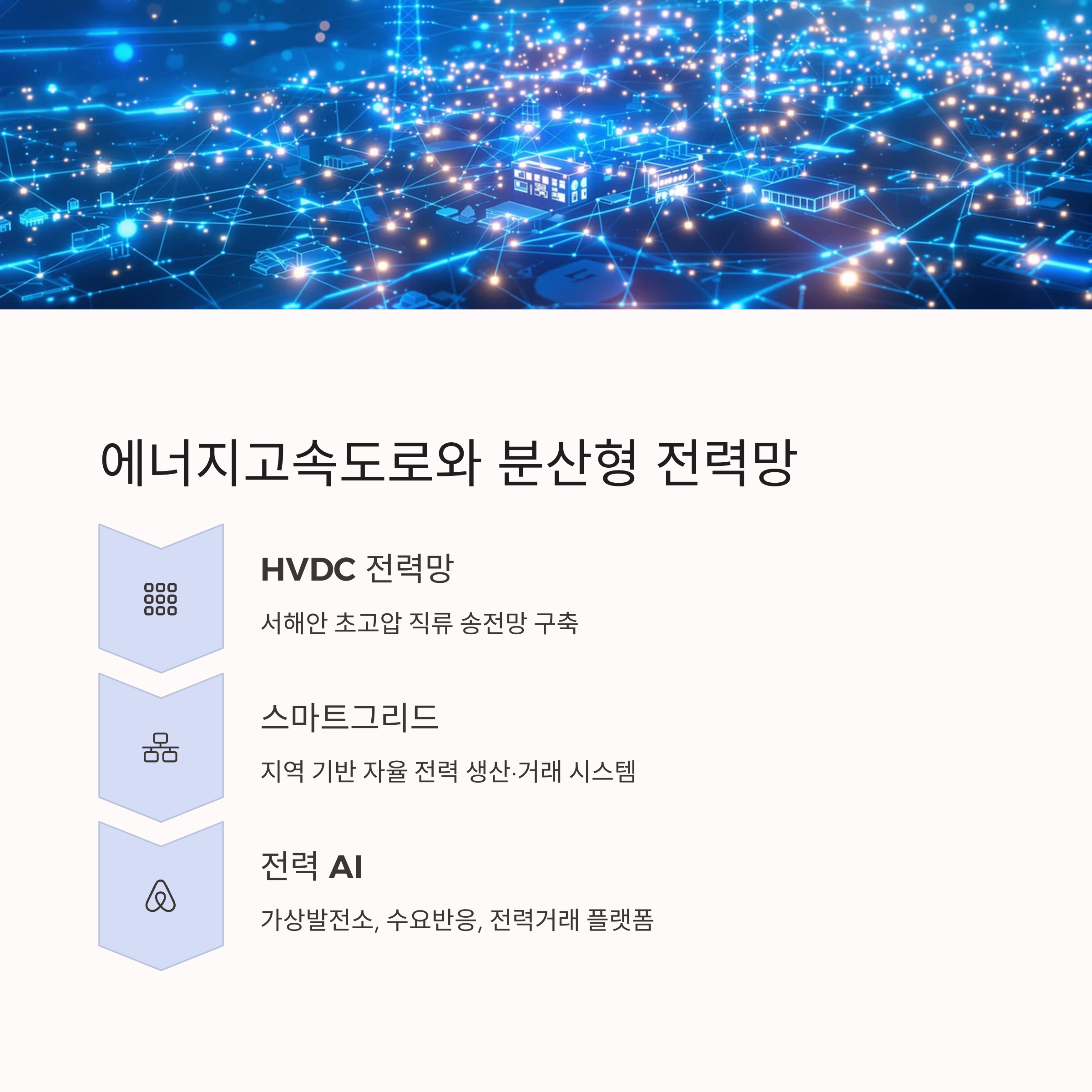 에너지고속도로는 서해안 HVDC(초고압 직류 송전) 전력망 구축을 통해 재생에너지 송전 인프라를 확충하는 사업입니다.